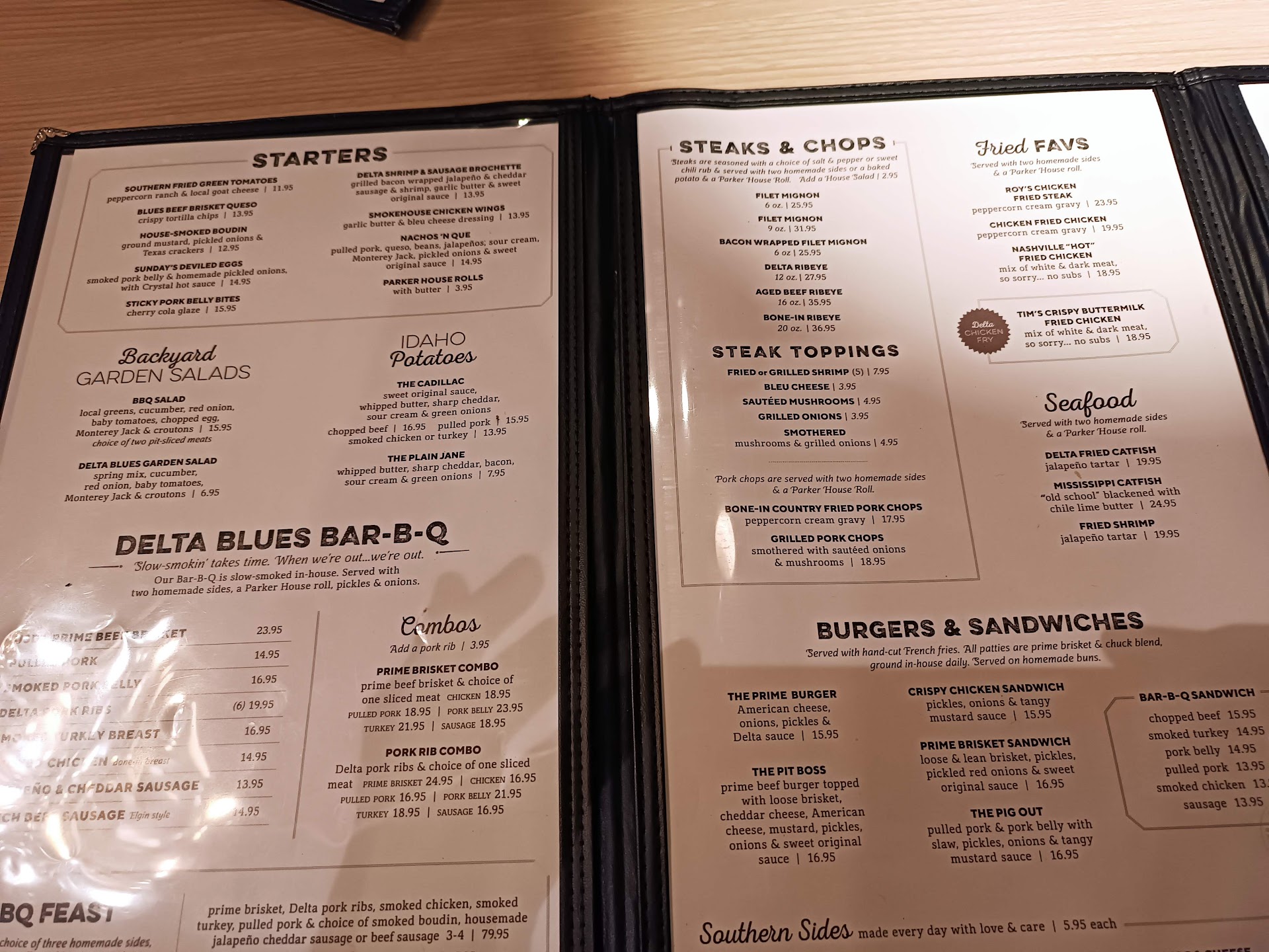 Came here this past weekend for my 6 year anniversary. We wanted to make sure the place we chose was going to have guaranteed great service so we had to stick with a Pappas restaurant! This was our first time at Delta Blues and we had such an unforgettable experience! Our server Chris was extremely attentive and made the best suggestions! He suggested the wings or the pork belly bites as an appetizer, so we went with the pork belly. The cherry cola glaze along with the crispy pork belly bites was a perfect start to get our pallets going. We also accompanied it with the frozen whisky smash and the smokin ace for our cocktails. The frozen smash was perfectly balanced and the mint was really coming through but not overwhelming. Smokin Ace did throw us off because we missed the wine ingredient that was listed on the description but to our surprise it was so smooth, sweet and well rounded. My favorite thing about the drink was the smoked cinnamon wood chips they use to infuse the glass. The smell lingered the whole time, I could not stop indulging in it. Chris made it easy for my husband to decide on how he should have his ribeye and man was he right. The simplicity of the salt and pepper for the steak here was outstanding. It was crispy on the outside and mouth melting. The steak didn’t need anything more! My chicken fried chicken was juicy and exactly what I was hoping for. I love that they have sweet carrots but the star of all sides is in fact the mac. The Mac n cheese is salted just right, so right and creamy that we ordered a second one! Out of all the Pappas restaurants, Delta Blues is our new favorite. We will be back and ask for Chris and try more of his personal favorite...
