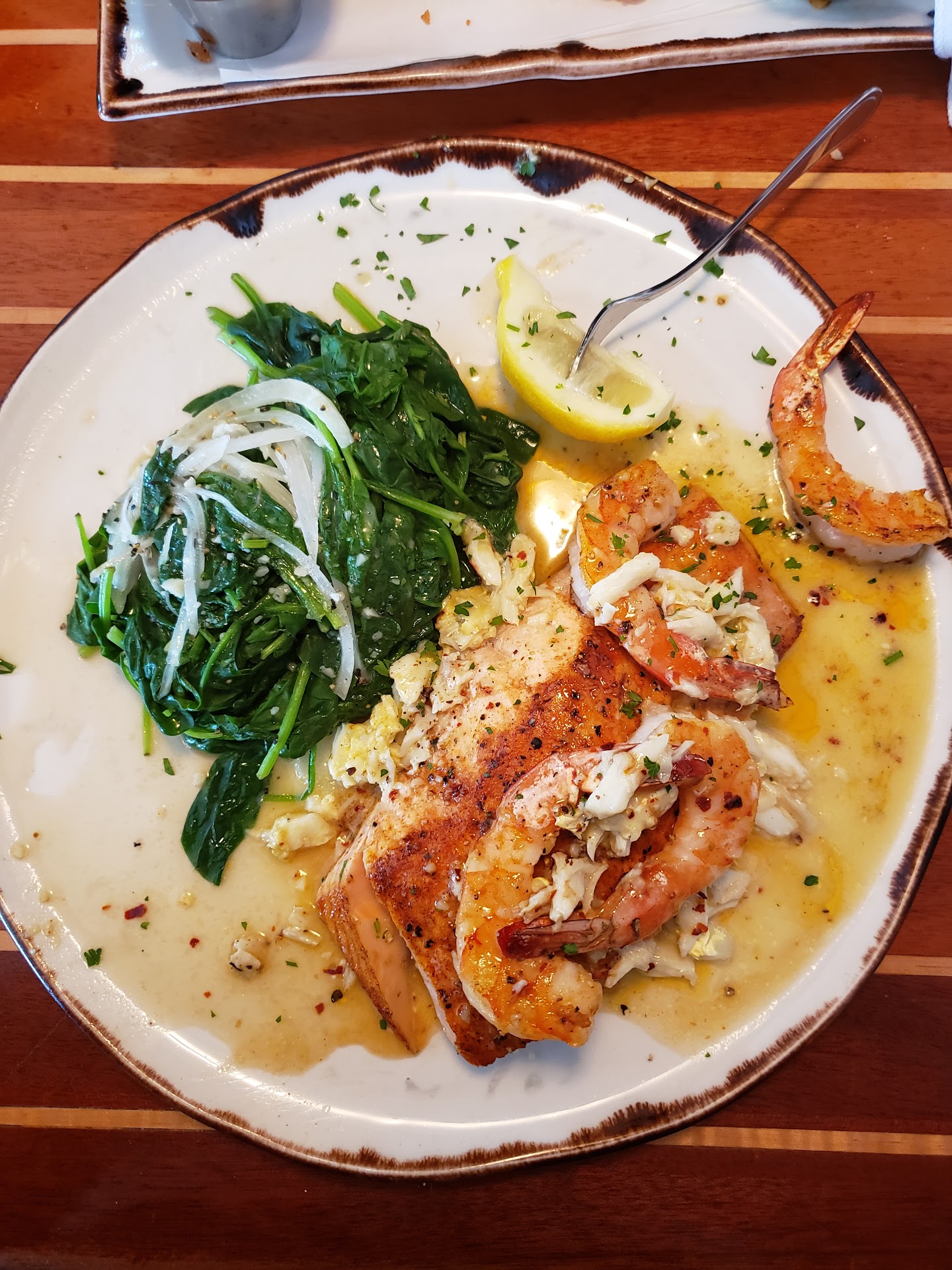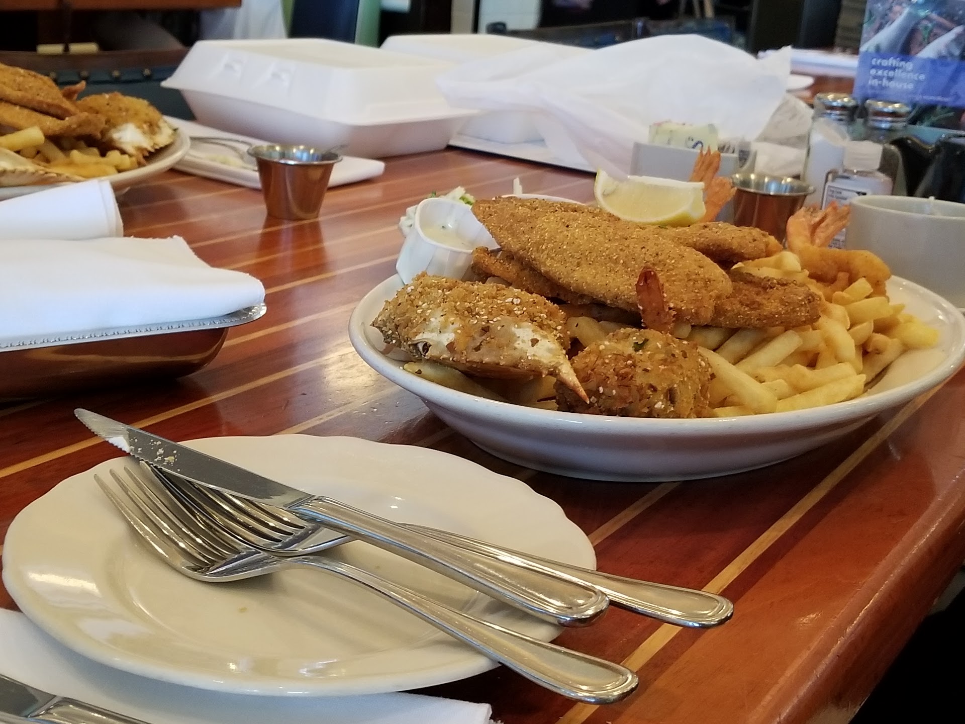 Read moreFinally ,finally , I found a place that cooks hot food. Food so hot the waitress had to put it back on the tray when she tried to pick it up. Thank you Lord. There were a lot of seafood selections and the fried chicken tenders are lightly breaded and delicious. The fish is fresh everyday the shrimp were jumbo and tastey. The food overall are not seasoned too much just lightly seasoned taste fresh and the platter came with a load of French fries that are lightly seasoned. The atmosphere was nice , noisy the waitress was great and worked hard to make sure everything was great. She even remembered things we forgot to get. There was a problem with the temperature in the restaurant it was pretty humid and uncomfortable, like they turned off the air conditioning and used fans. They need to turn the ac cooler for the customers confort. Another problem is the price very pricey especially the chef choice with the expensive seafood but the taste is great the white wine sauce is superb. The food can run from the 20's to 30's and higher for seafood and pricey fish meals. Ask for bread and butter when waiting for your your food. You can replace oysters or scallops with more shrimp and vice versa. If it is your birthday you can get a desert for free ,but no birthday song ,but the the piece of cake or pie is very big. All in all a good restaurant with tastey fresh from the scratch hot food and great service for a high price but worth it to me. I have found my new...