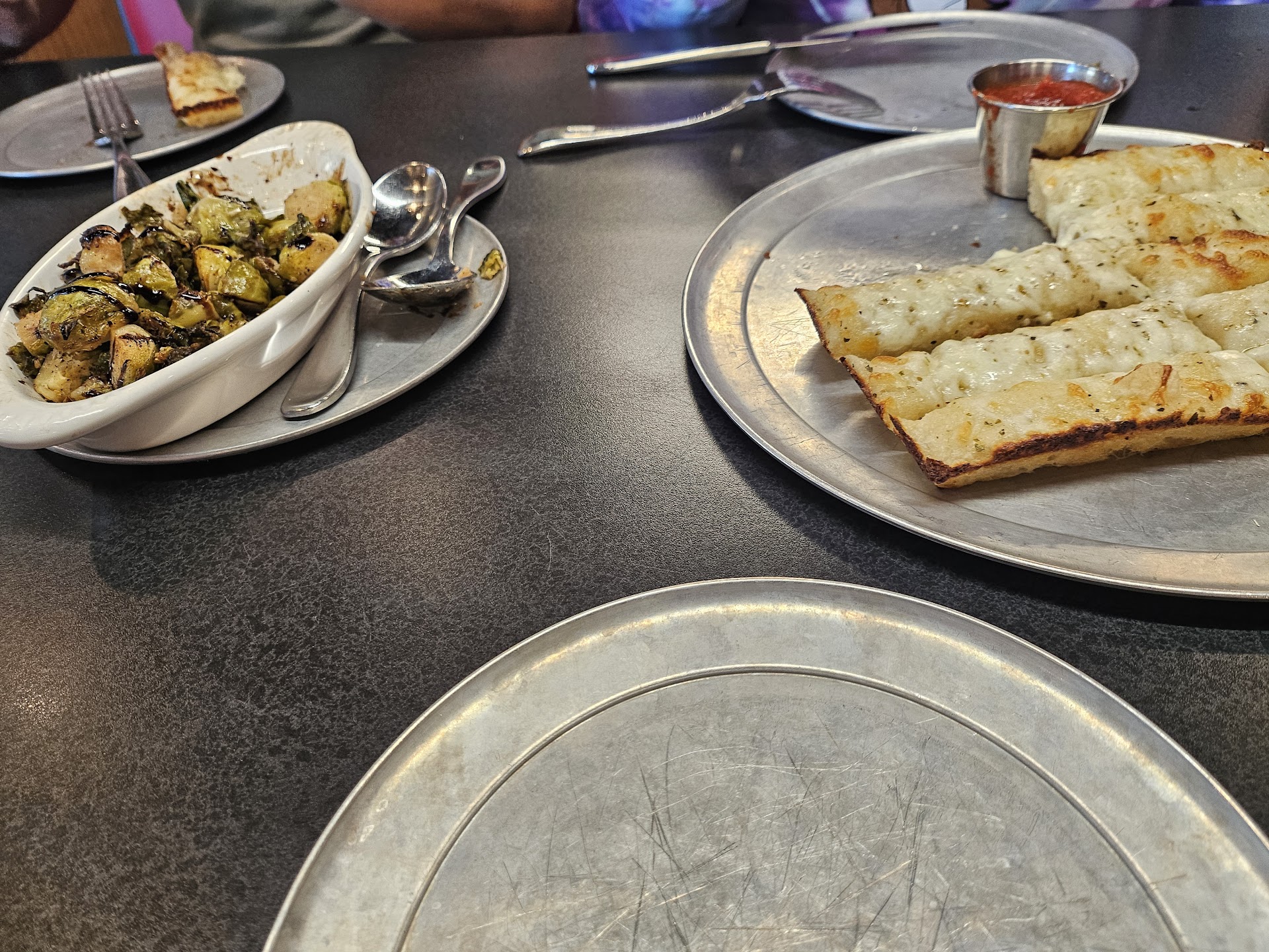 We ordered some cheese bread off the happy hour menu, and as tempting as a drink from the bar was, I could not break that rule of not drinking Mon-Thurs. The cheese bread was delicious! I could have eaten that and been satisfied, but I figure I may as well continue on my rebellious streak and order a pepperoni pizza with mushrooms.