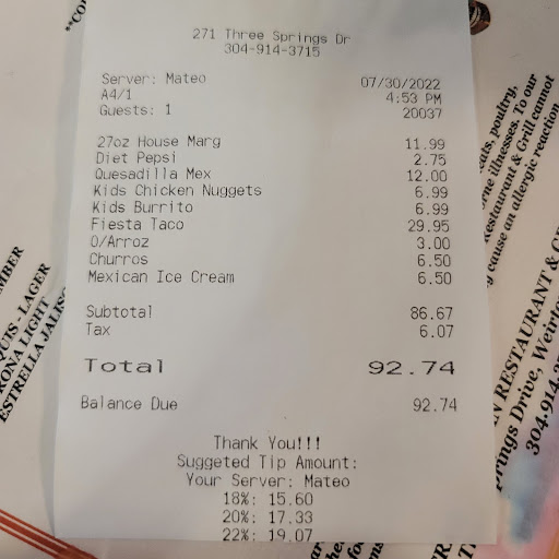 Tonight we celebrated our anniversary and we ordered: a lime margarita, chips & salsa/cheese dip, Fiesta Tacos with a side of rice, quesadilla mex, fried ice cream and fried churros. Our waiter, Mateo, was amazing and kind.