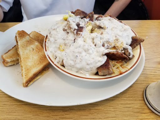 This place is very unsuspecting. If you're not looking for it you'll probably drive right right by it. Don't expect the inside or the decore to 'Wow' you, it wont. But don't leave just yet. Let your waitress step over who will be as nice as can be and full of charm. An actual waitress who anticipates what you will need and gets it before you even have to ask. The menue isn't 52 pages long but does it really need to be??? I myself had the omlet and had to laugh when my waitress brought it to the table,,, wondering how she carried the serving platter its served on plus another mean at the same time. I say serving platter because my omlet was so so huge it was served on a dish I would normally place a roast to serve or take to the table for Holiday!!! My husband and I both took home boxes. Price was below what I'm use to paying, extra to waitress. Give it a try they have all types of food my next will be the salad. Hope this review...