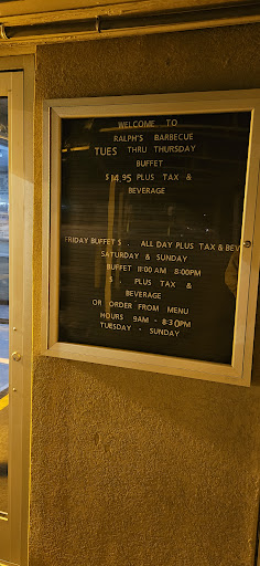 I did the buffet option. I was meeting someone halfway at 7:30pm and there wasn't many options on food at this halfway point, so we found ralphs online. It was rated pretty good over 4 stars & has been open since 1952.. should be alright? NO. There was ONE item I was able to take more than one bite of on their WHOLE BUFFET menu. The employees sat around in a circle laughing, most were young, maybe a little stoned, I'm sure its an entry level position, which is fine, of course. I never even got a refill of my water which I needed immedietly. The register might be from 1952 when the place opened or something; it was so slow and the girl at the register ,instead of acknowledging us as we checked out, ignored us typing away slowly from the PREVIOUS takeout order. I said HI. And she just said hi and kept typing. hahaha. The one food item to get ? It's like a pulled pork or brisket with a reddish sauce..couldn't tell because none of the items at the buffet were labeled. I asked the guy behind the counter and he said he couldnt think of the name of the item I asked about. LOL. So I asked what's in it instead & he couldn't think of that either & asked another coworker who finally had a little more of an answer. But don't get it confused with the other pulled pork next to it because THAT ONE seems as if it just marinates in pure VINEGAR as a seasoning. But don't worry, if you don't like seasoning - ALL of the other food there is also NOT seasoned whatsoever, and this is coming from a white girl from the NORTH. I was really hoping something would be good about this place as I drove 2 hours to it, but I paid $18 a meal and not one part of the restaurant was good besides MY company. I wasted the plates in WHOLE (such a waste💔) and they didn't even question it either. I'm so sorry to leave a bad review but people need to know ahead of time so they don't drive 2 hours here; go another 20 minutes out of your way for...