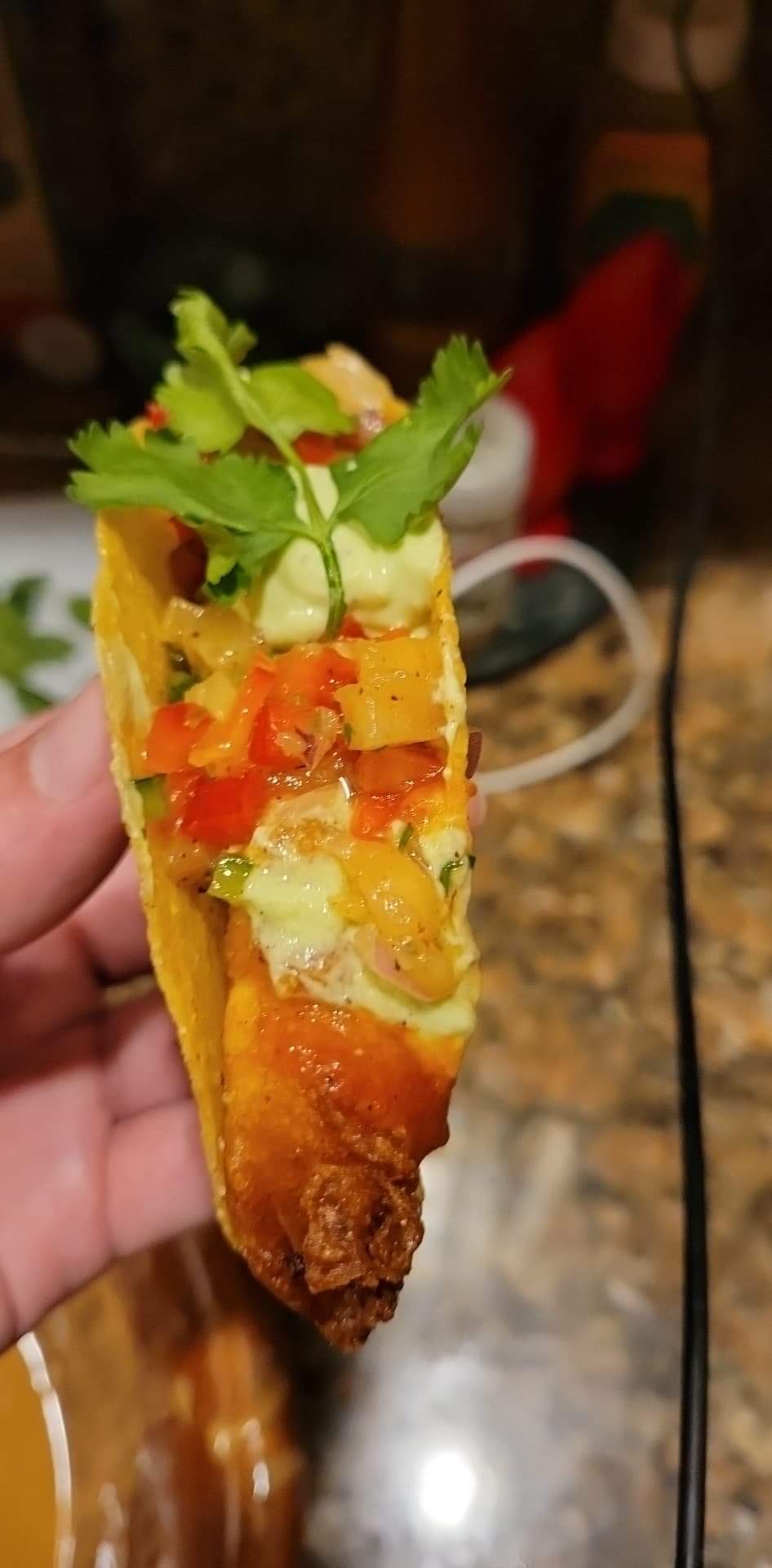 As I was limited with cooking supplies as I was on vacation the tacos don't look great but the tacos where as follows: spicy beer battered halibut, avocado cream, grilled pineapple salsa, Chilli sauce...