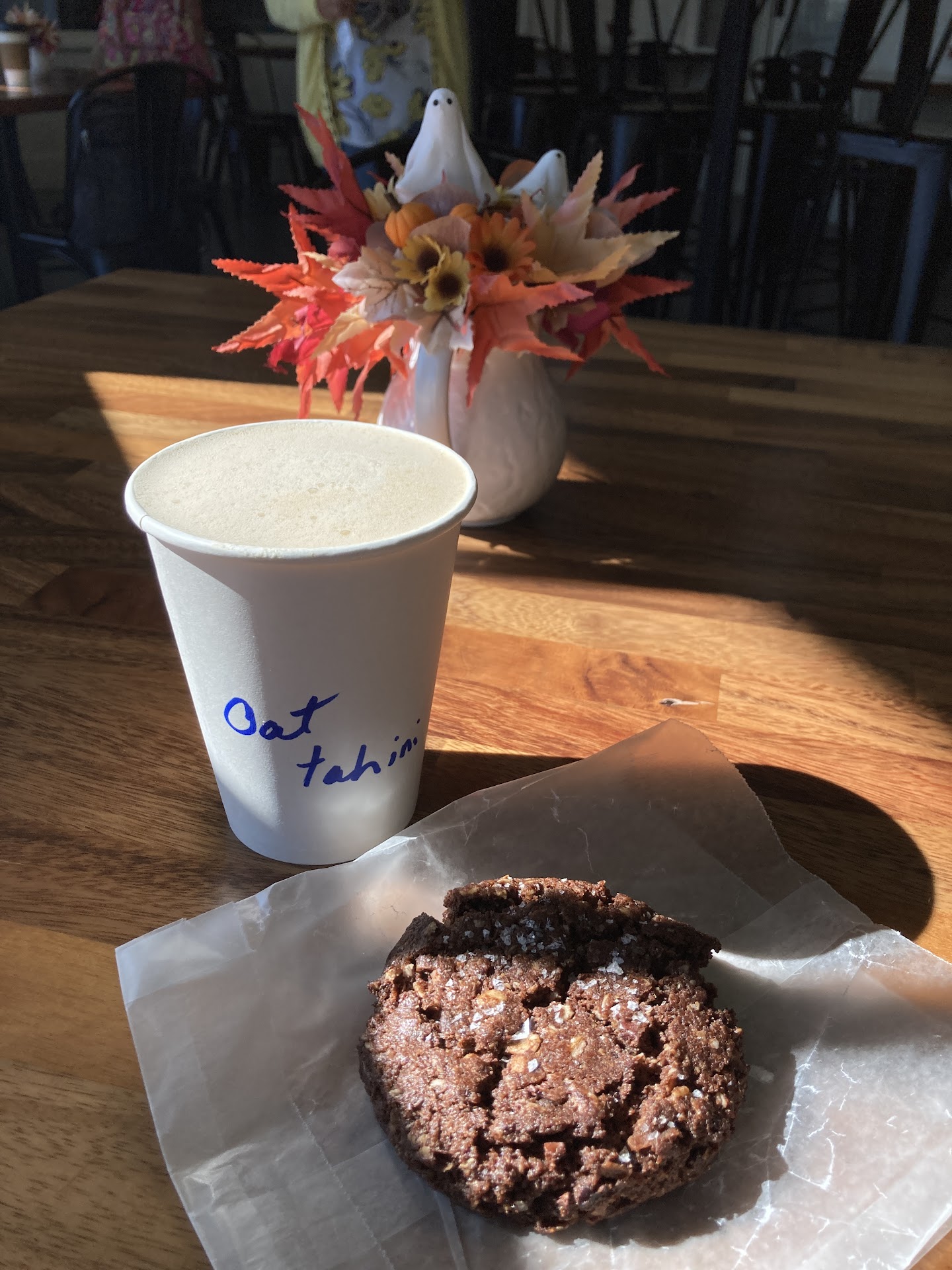 I ordered a Tahini latte - which only comes in small, and a vegan cookie. They use Carpe Diem beans (roasted a town over in North Berwick), so I had an idea of what the espresso would take like.