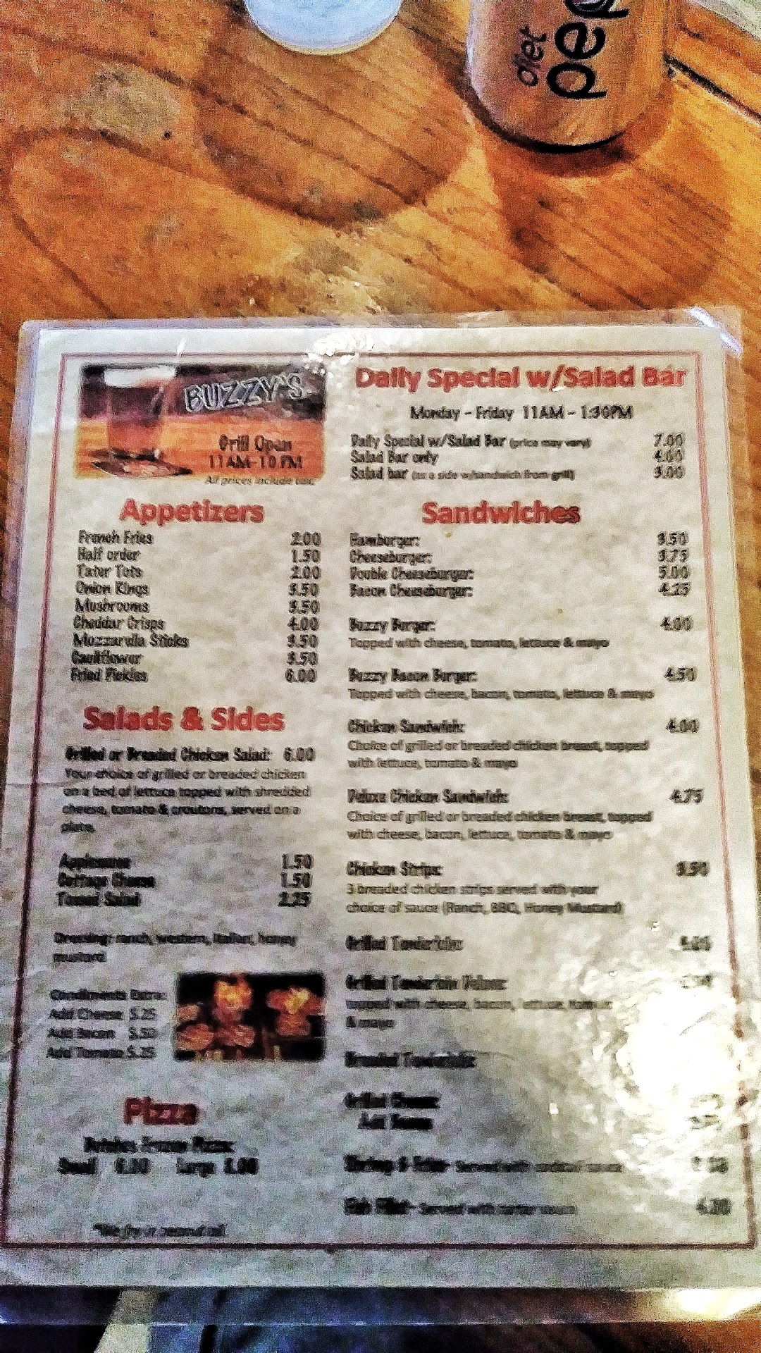 Per the menu, they have a salad bar and daily specials at lunch time Monday thru Friday, and they also serve Mexican food items on Tuesdays. They do have salads available as menu items. Most sandwiches are in the $3.50 to $5.00 range. Pizza is also on the menu.