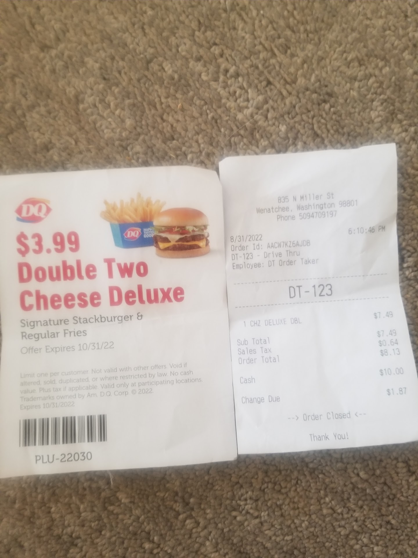 Read moreWe get blizzards often, so we know what to expect from the average blizzard of our choice. We came through Wenatchee and decided to get some DQ for the trip home, so we came into this establishment. We ordered pumpkin pie, heath, and hot cocoa peppermint blizzards. Mine came first (pumpkin pie), and the visual presentation was phenomenal. Just like I'd design it if I could get behind the counter and make it myself, with lots of cinnamon! (Side note, I never think there's enough cinnamon on anything đ) As I ate it I was blown away with the amount of care that went into making it. It was so smooth, so well blended. And, one problem I've specifically had with the pumpkin pie blizzards are the bottom third is always straight vanilla ice cream. I don't know why but they never get blended all the way through. This was blended ALL the way through. I could just tell that the person who made it really took their time. They did not just throw ingredients in and blend for a few seconds. I've never had such a perfect blizzard before! When my husband and daugter got theirs, I hadn't even mentioned my thoughts yet, and they both said this was by far the best blizzard they've ever had. So it's settled! If you want to have the perfect blizzard, come here on a Saturday night. The crew is not only extremely friendly and professional to the customer's face, they also go the extra mile to make your treat enjoyable. We will be sure to come back every time we're...