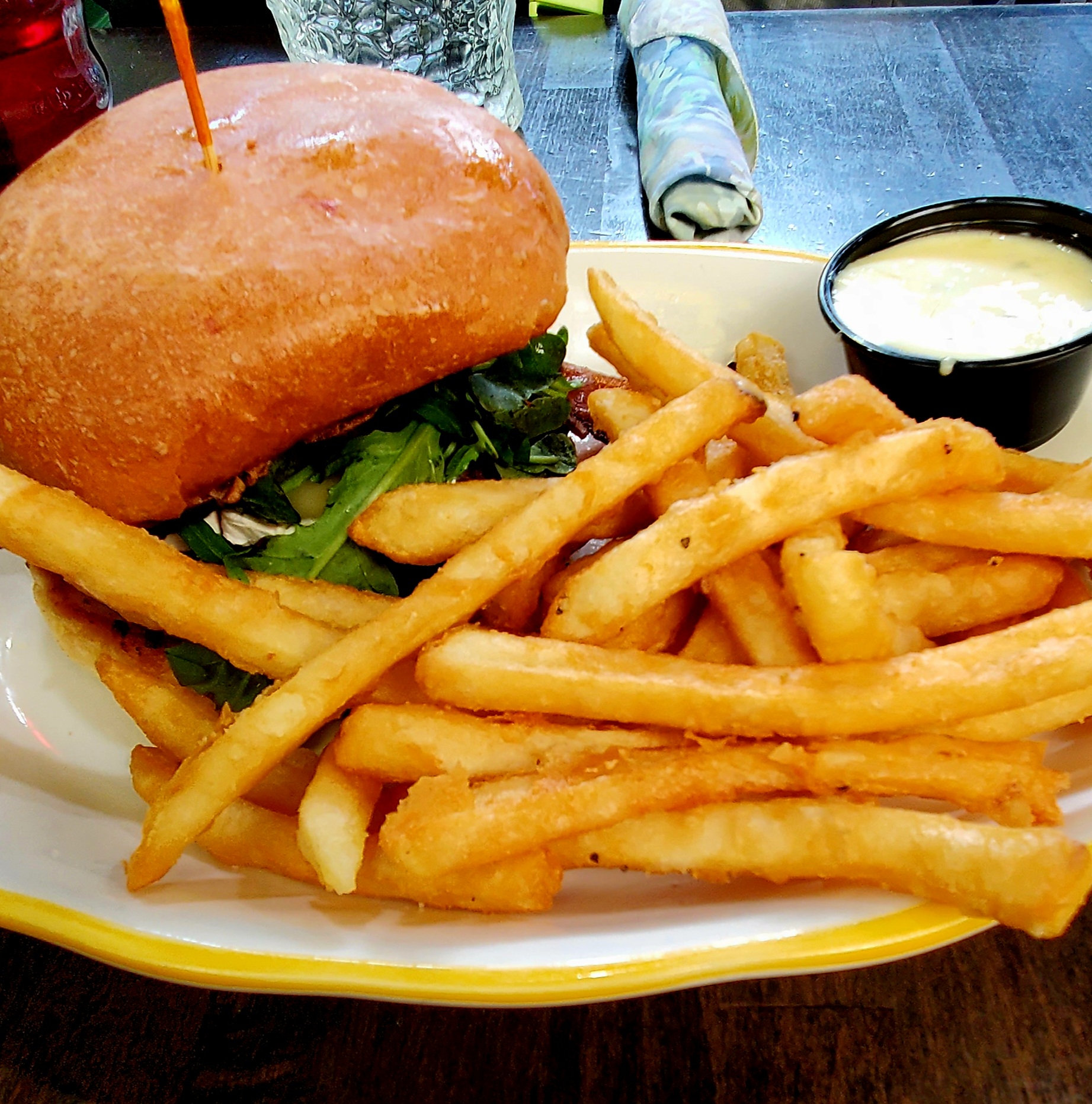 The Huckleberry Burger: Fluffy bun, slightly peppery fresh arugula, tangy pickled onion, a bit of creamy melted brie, thin crispy bacon, a somewhat wimpy burger patty, and some spicy sweet jam on the bottom. There's a lot going on with this burger, bordering on too much. Each bite somehow tasted of everything and nothing. The burger patty gets lost in the fray, and even the brie is clawing for its share of the palate. It isn't bad, but it could be better with either omitted ingredients or varying the portions of this meal that comes in at $24 after tip.