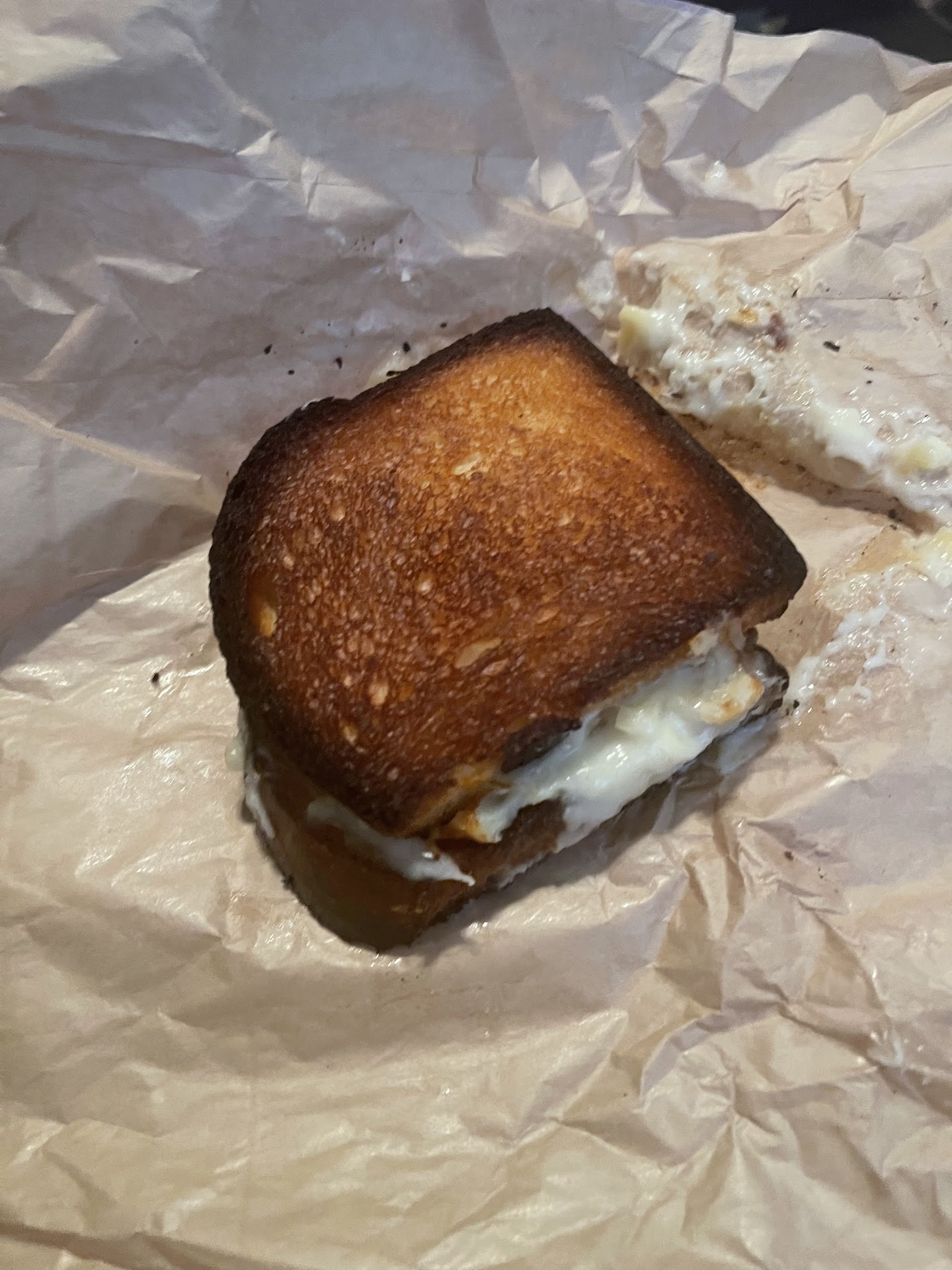 Then, when we opened our food: the avocado toast literally only had avocado (or lack there of), some lettuce greens and huge chunks of feta- no tomatoes or green goddess dressing; the asiago sausage and egg bagel sandwich didn't even have the sausage on it.