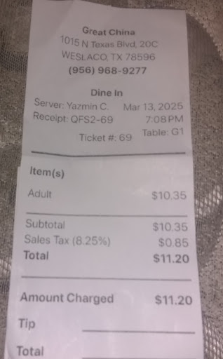 Read moreSo this is a local Chinese buffet. Minimal to moderate choices. Food is OK. Nothing special. I think the service is very good in reference to the waitresses helping you out. Atmosphere is horrible. Has a very trashy feeling to it. The reason I gave it two stars is because the food is not bad. But I feel like it’s a very dirty place and I have pictures of cockroaches on my table. We did bring it up to the waitress and management only gave us 15% off each plate. That’s nice of them but don’t you think a refund or a bigger discount would be better with a nice apology from the owner? We never saw the owner, and they threatened to call the police if we didn’t pay for the meal. We never said we weren’t going to pay. We just wanted to bring up the cockroach. If the owner or management would’ve talked to us and been very apologetic. I wouldn’t have left such a bad review. If the owner sees this review, I hope he/she understands that the customer is always right that’s the difference between a good business a bad one. I am very disappointed with Great China. One more thing the waitress said they’ve been having cockroach problems for a while. I can’t believe they haven’t been...