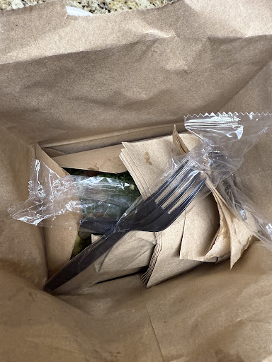 I’m also including a picture of how my food was bagged today. The box was open, and my meal was placed inside with the silverware and napkins loosely thrown in, which raised concerns for me about cleanliness and proper food handling—especially as I’m...