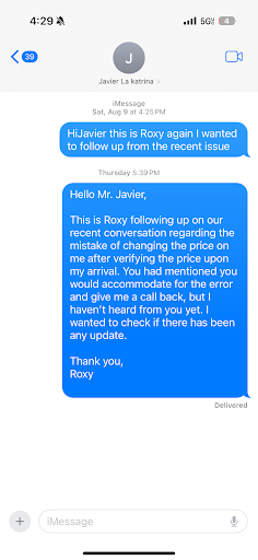 What makes this experience especially disappointing is that the owner Javier personally reached out, promised to call me back, and said he would credit me the difference to honor the original quote. It has now been over two weeks, and despite following up twice, I have received no response and no resolution.