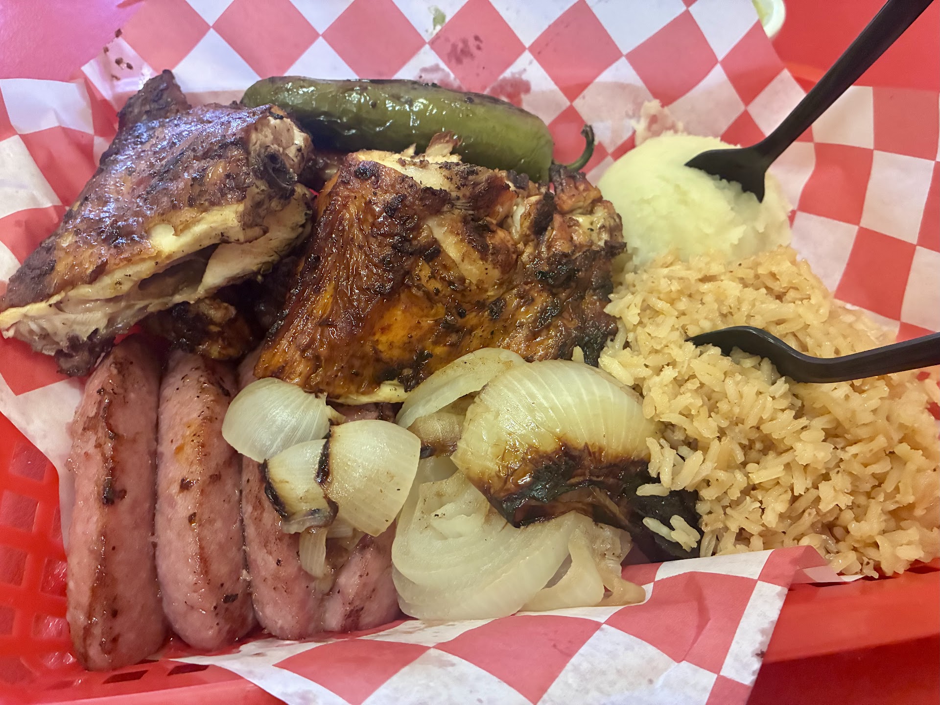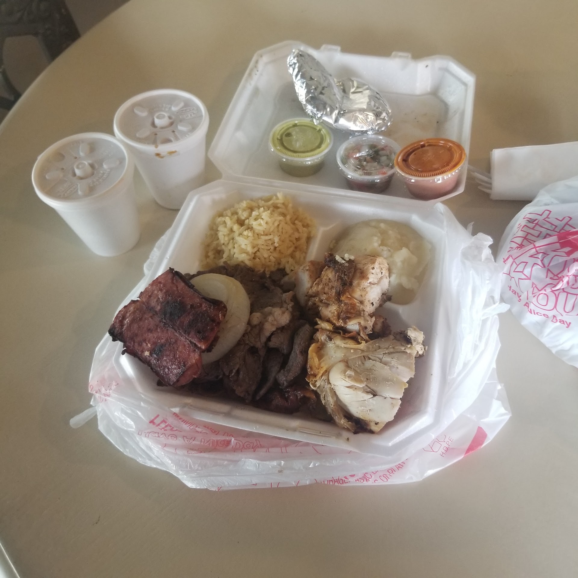 I am so glad we went to this restaurant. We bought a combination meal of chicken meat and sausage, it came with mashed potatoes, beans, grilled peppers and onions, some chips and some spicy sauces. I added an extra quesadilla and I think the total bill came to less than $20.00. We did not have to wait long for the food. We had ordered take out, it weighed a ton.