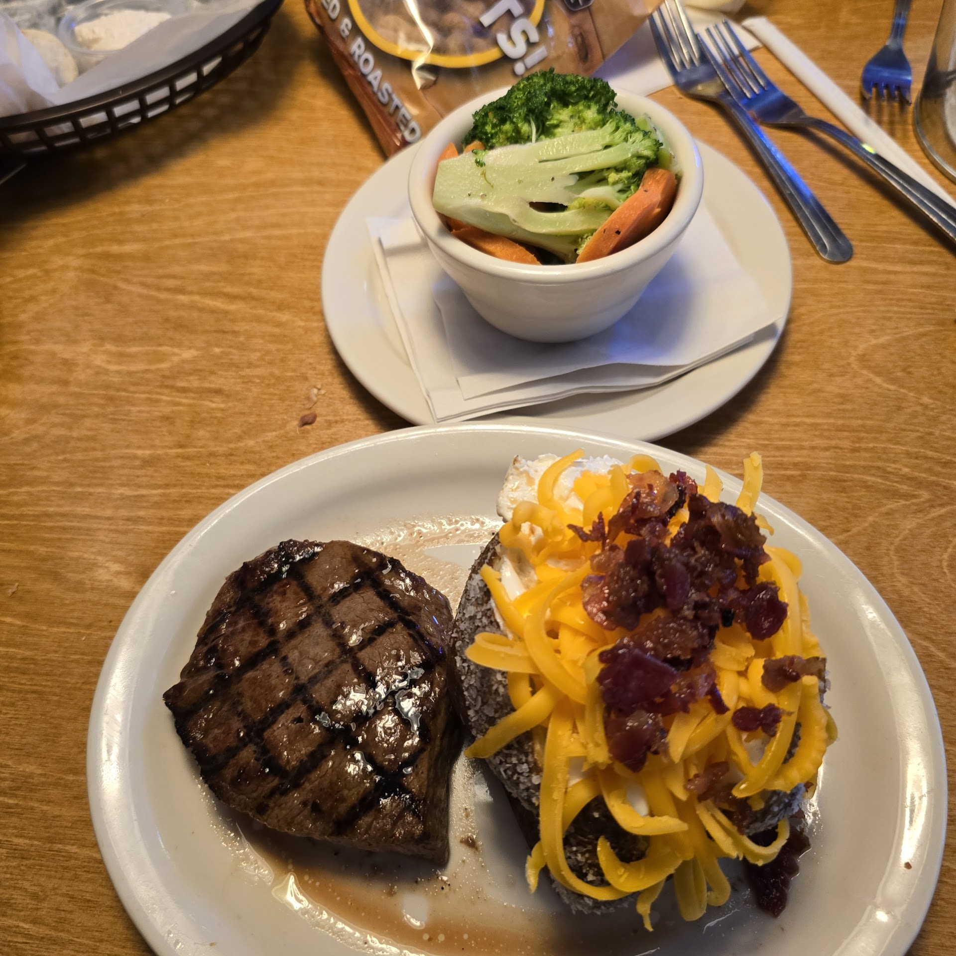 We had the early special. I got the 6 ounce sirloin with a loaded baked potato and fresh vegetables. That and the bread was more than enough food.