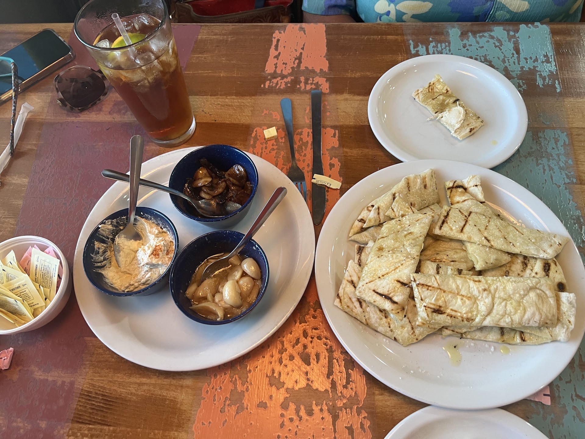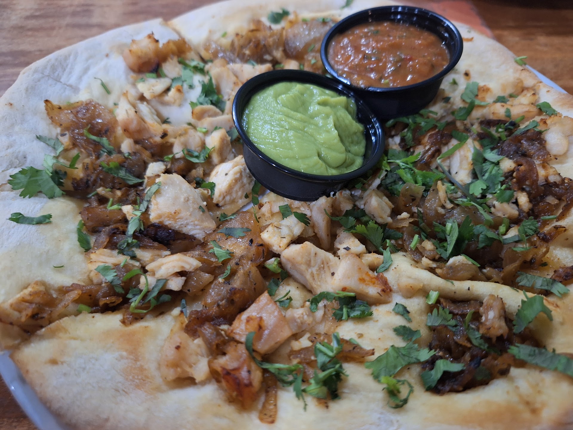 The food is always excellent - the pita bread and dips, esp. Roasted Garlic and the Goat Cheese ones are awesome. The pizzas are great, easy to eat, not too thick. The pitas are similarly great and filling for sure. The chili is Terlingua style, my husband enjoyed it. It's a little brothier and has chunks of steaky beef vs. ground burger. (It's avail. on Saturdays).