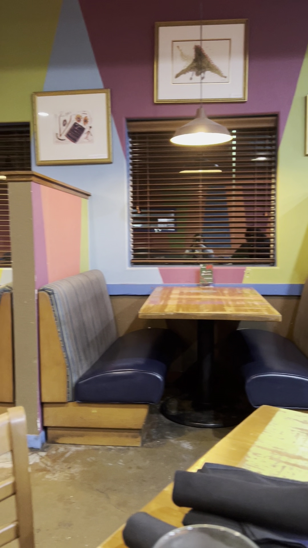 The walls have pop-art type paintings on them that are signature Blue Onion, as they have sold those for years, dating back to when they were at a strip mall. The tables/booths are truly in need of a good cleaning or perhaps replacement. The booth in which we sat smelled like an old vinyl chair, so just a little TLC could make a difference. The outside is also very dismal, and the onion sign is hard to see; it should be easy to see, like a big blue neon onion that invites people to have the great food there....