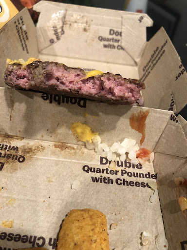 What did I get? Two meat patties on a bun. Nothing else. And a weird taste. What are you cooking these on? Are they rotten? Why are they spicy? Since when is McDonalds meat spicy?