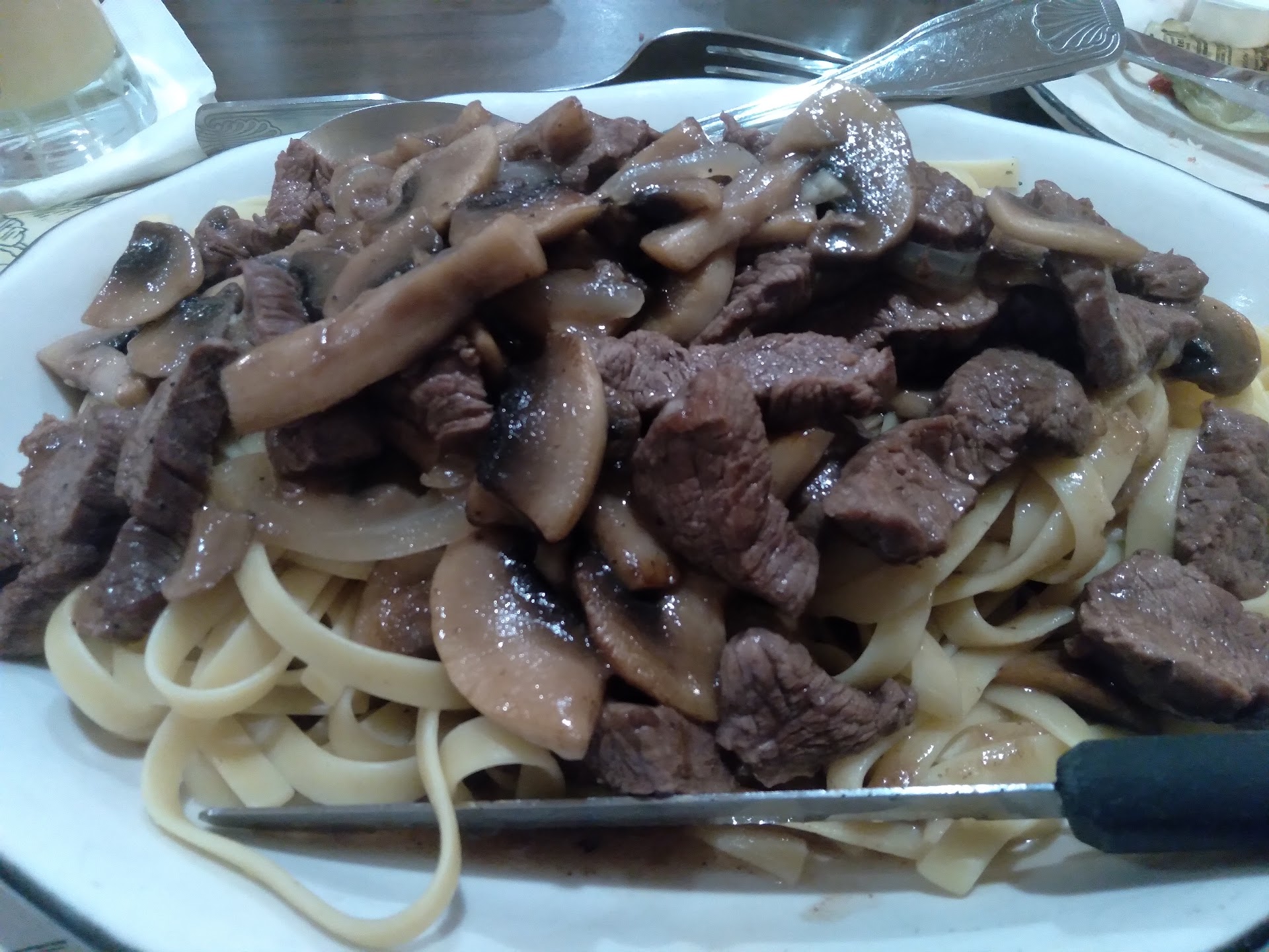 The food was excellent. I forgot to take a picture of my Zia Maria, and didn't realize it until it was half gone. Ice cream drink with Amaretto and Banana Liqueur, topped with whipped cream, and a cherry. YUM...E! One person ordered the Vegetable Combination appetizer for the table. The onion rings are breaded and oh so crunchy and the Fried Eggplant is crispy on the outside with a very creamy inside. Around the table we had Linguini with Fresh Shrimp and Clams, Homemade Baked Lasagna, Spiedini A la Siciliano, and two of us had the Tagliatelle A la Romano. The beef was so tender and flavorful. Everyone thoroughly enjoyed their choices. So much food. Served with soup or tomato juice AND salad, garlic bread, and Italian bread - as well as breadsticks. I haven't seen breadsticks on a restaurant table in forever. So I had lunch today, and will have lunch again tomorrow.