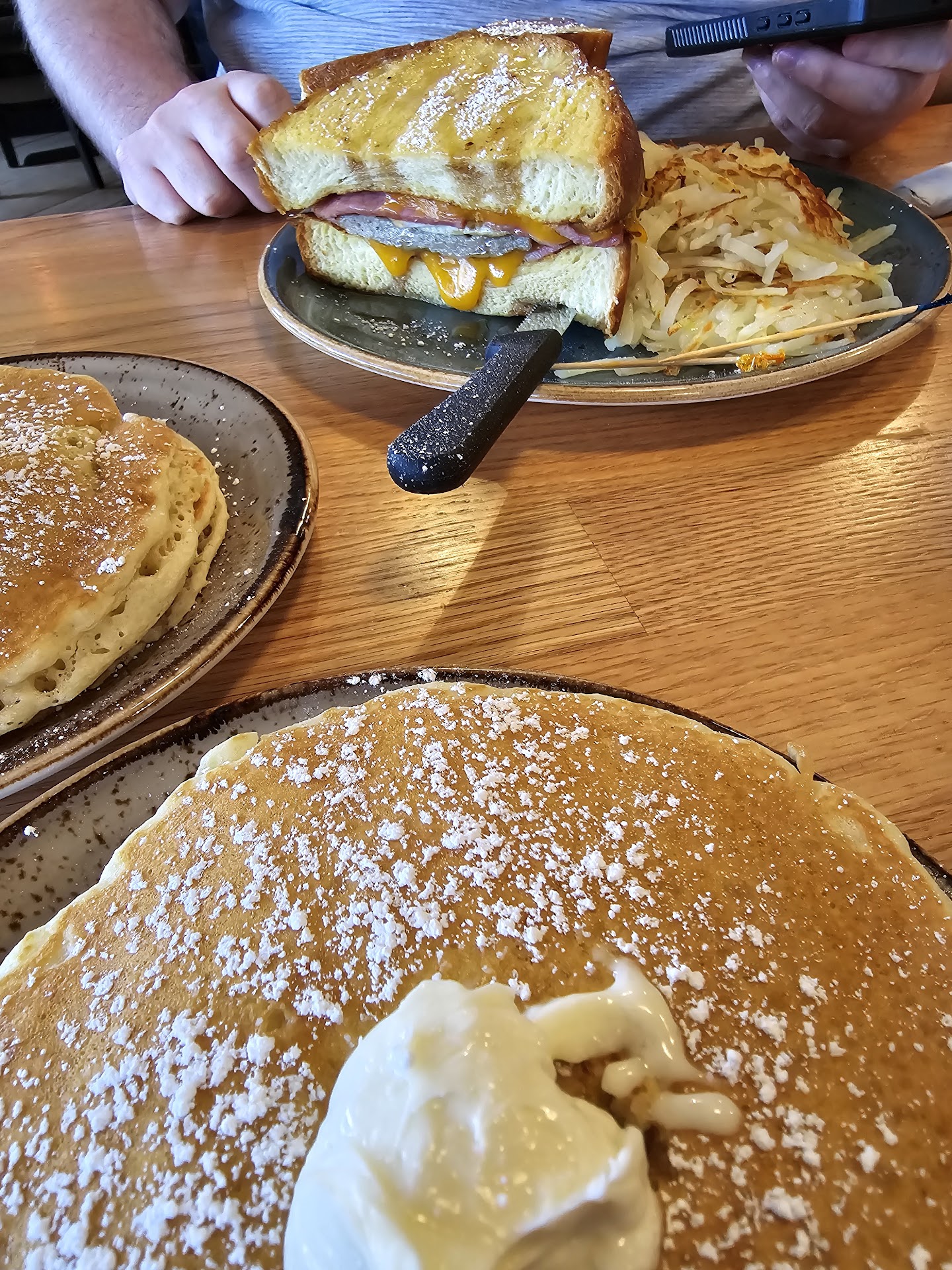 The food came out very fast. I ordered the Senior Special because I was looking for a lower portion size (and price). I was interested to see how the pancakes were undecorated. This is a good judge, as it sets the bases for all of the extravagent toppings. It was plain and needed the syrup. Honestly, I highly recommend the owner to take a small trip up to Rivers Edge Restaurant in Saukville, known locally as The Truck Stop. Their plain pancakes will blow your mind. If you can encorporate that flavor into your pancakes here, business will be booming. It's worth the trip.