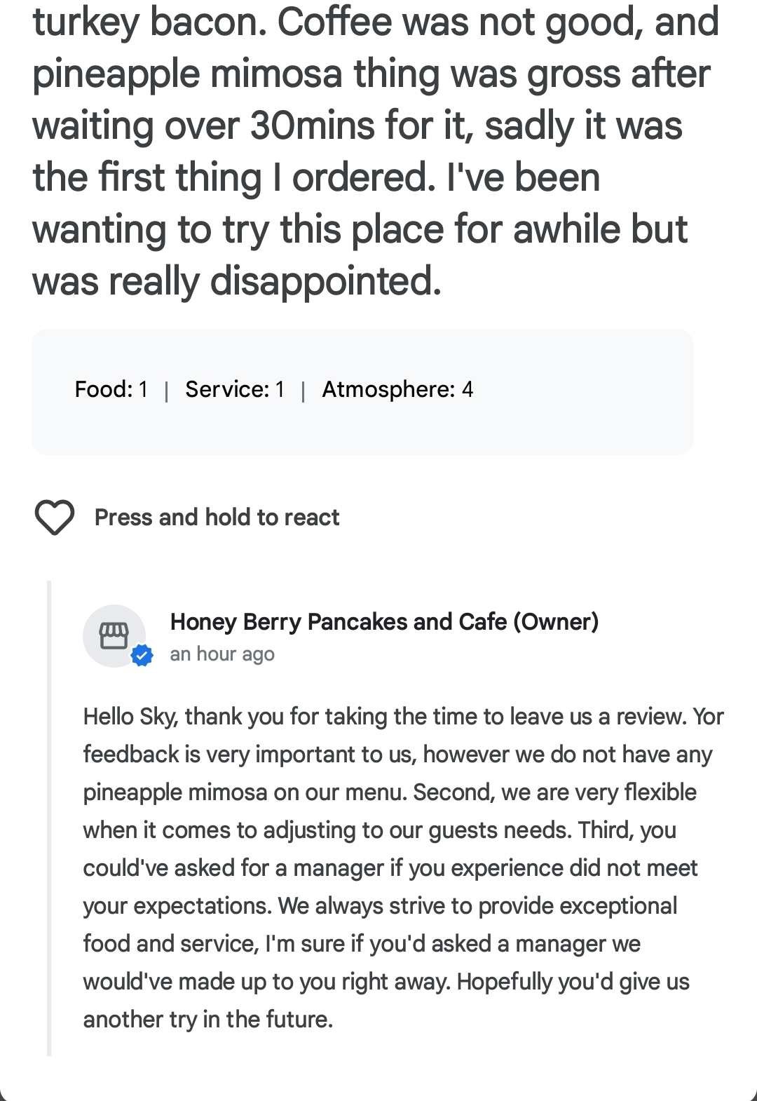 I will not give this place a second try. And the repeated Management comments to reviews here shows no concern other than repeating himself and asking folks to revisit 😆 the people that find this food delicious ought to try BKC/ Mad rooster/ First Watch or even George Webbs instead.