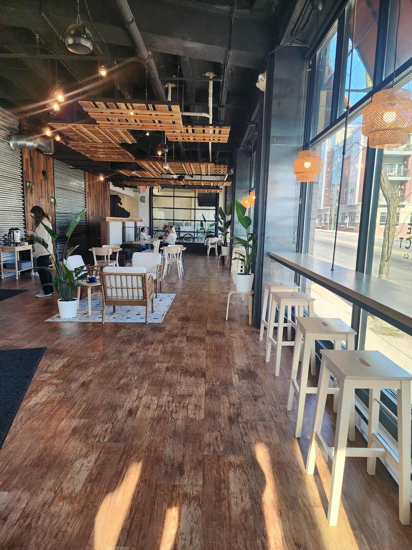 It's an old shaped space, due to it's location at the intersection of national and greenfield. It's long and narrow, which allows more private/cozy seating areas, and there is plenty of light. It has a clean, modern feel to it.