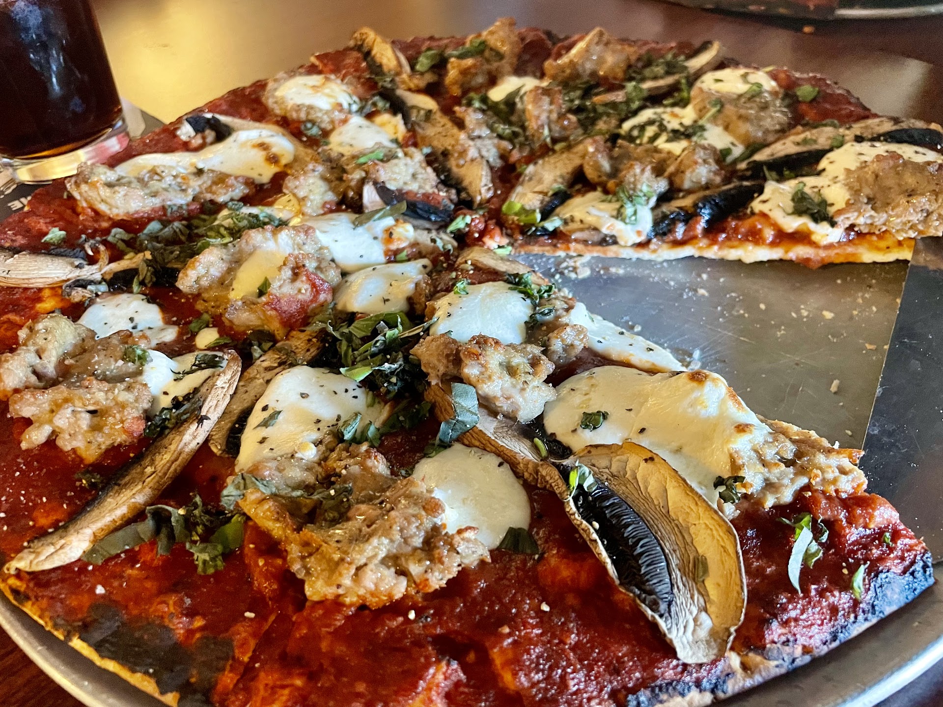 For our main dishes, we ordered two large thin-crust pizzas—one build your own sausage and pepperoni, and the other was their magnificent portobello and sausage. The pizzas were perfectly done with a crispy, satisfying crust. The portobello pizza had a unique flavor with its rich tomato base, thick-sliced mozzarella, and huge, juicy portobello slices, with the basil tying it all together beautifully.