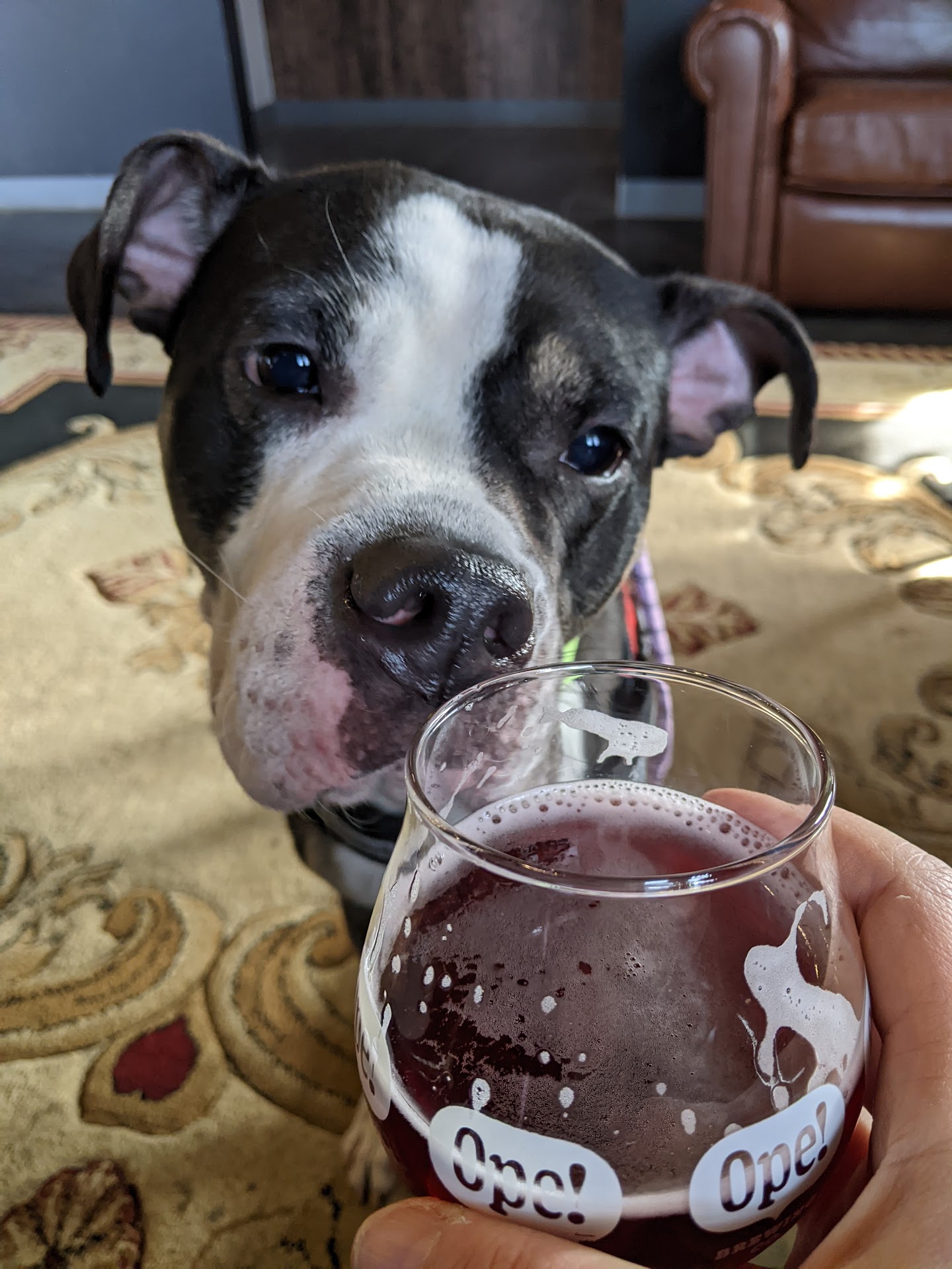 I've been going to Ope! since they opened (Ope!ned?) a couple years ago. They are a couple miles from my house but location isn't why I go. I love the space, that there is ample seating inside and out, and also different kinds of seating: I sit on the higher stool-like seats when I meet friends, on the comfy couches when I bring a dog, and on the sturdy chairs when I bring my elderly mom. I also love trying all the beers (their Blueberry Sour is my fave). They do a lot to foster a feeling of chill community. There are always families and young/old/etc. But let's talk about the dogs! In addition to being dog-friendly they also support local shelters and rescues. I volunteer at one and brought an adoptable dog, Paola, on a field trip a couple months ago. Even though she is a shy girl, she loved going to Ope! because we could move around, meeting and greeting people and then finding a quiet place to sit and relax. That's her at Ope! in the pics (she has since found her forever family) and while she was very interested in my drink she did not get to try it.