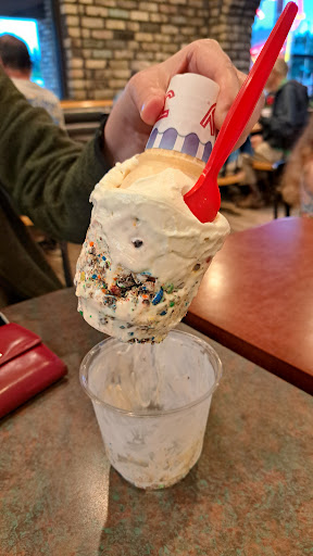 Read moreRead moreWhen we stopped in the first time I was hungry but the little girl in the backseat wanted ice cream and I was delighted they had food. Her and mom just wanted frozen custard. Sorry she's not quite 2 and I think doesn't understand the difference between ice cream, eh, to frozen custard, yum. I ordered a grilled chicken garden salad, bowl of chili, a quart of vanilla to go (they kept it in the freezer and just had me show my receipt on way out) and the mom and youngling got a sundae with sliced bananas, I was supposed to get some of the sundae at the end. I did get to have a bite or two at the end...it was probably the best frozen custard I have ever had and I've had a bit at 50 years old. The staff was friendly, the building had ambiance and felt like family after sitting down watching everyone enjoy their delicious frozen custard in a variety of sizes, flavors and topping combinations...then the food came. I'll start with we were dining in. Everything came in "to-go" containers, plastic cup for the frozen custard, styrofoam cup and plastic lid for the chili, plastic bowl and lid for salad and all utensils were plastic, wrapped in plastic film, all in a paper bag. I guess I wouldn't have as much of a problem if I thought there was any chance all of this was recycled. Since I didn't see anything but trash cans, I'm guessing they don't...but I could be wrong and would be willing to change my rating. My guess is I won't hear back from anyone. The chili was pretty good, better than mine. As I have said the custard was grand and I think a fair price. Which brings me to the grilled chicken salad. The salad was good, although somehow all of my sliced cucumbers were given to our daughter. All I got was the cucumber peels, she still spits them out. I get a distinct impression that the chicken isn't really "grilled" either. My guess is they have a stamp or a marker or something or maybe they drop them on a grill for an instant but the majority time of cooking the chicken is not on a grill. If it is, they do something else to it afterwards to make the grill marks nearly non existent and have no distinct char marks or tiny chunks of...