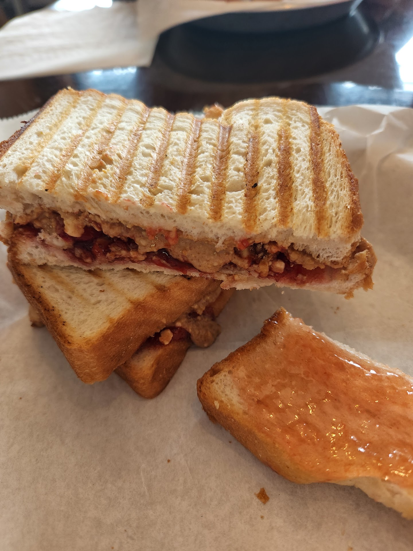 I, being the glutton that I am, opted for the "Double Decker", which I built with Seedless Raspberry Rhubarb Jam and All Natural Peanut Butter. Nothing special here, but the raspberry rhubarb jam was great, and i may have decided to switch to natural home-made peanut butter in the future because of this sandwich.