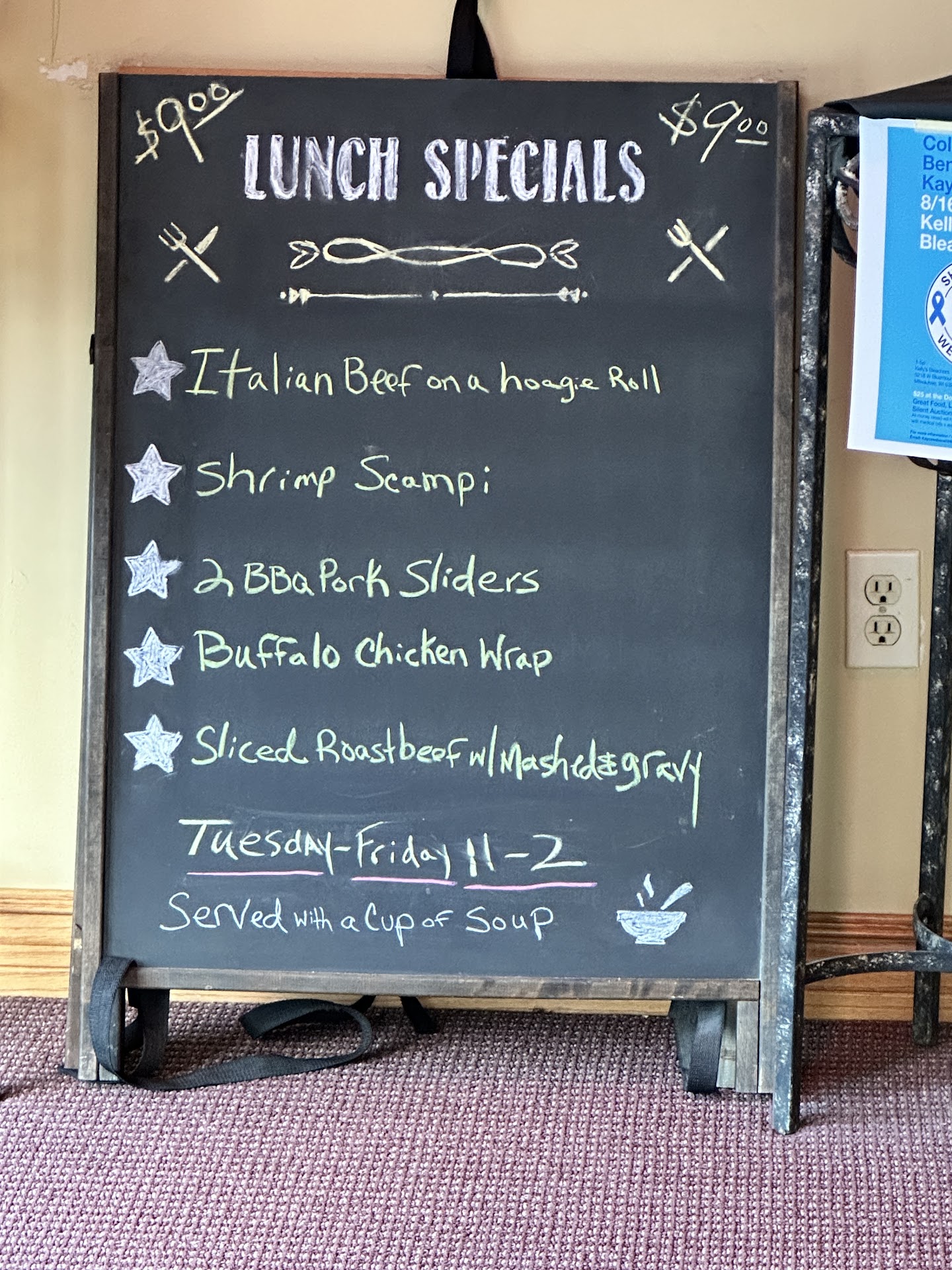 Read moreMy mom and I have been here for lunch twice in the past two weeks. We have so far only ordered from their daily special lunch menu which changes everyday. There are about 5 items on this menu, which include a cup of soup, also changing daily, for $9. Can't beat THAT price! We had shrimp scampi and chicken salad sandwich last Friday with New England clam chowder. Scampi was a good-size portion of linguine with garlicky butter sauce and 4 medium-size shrimp. Very tasty. Mom's chicken salad was served in a croissant with so much filling it was too big to pick up and eat so she had to start with a fork. She had a small side of tater tots as her potato choice. She said all was very good.