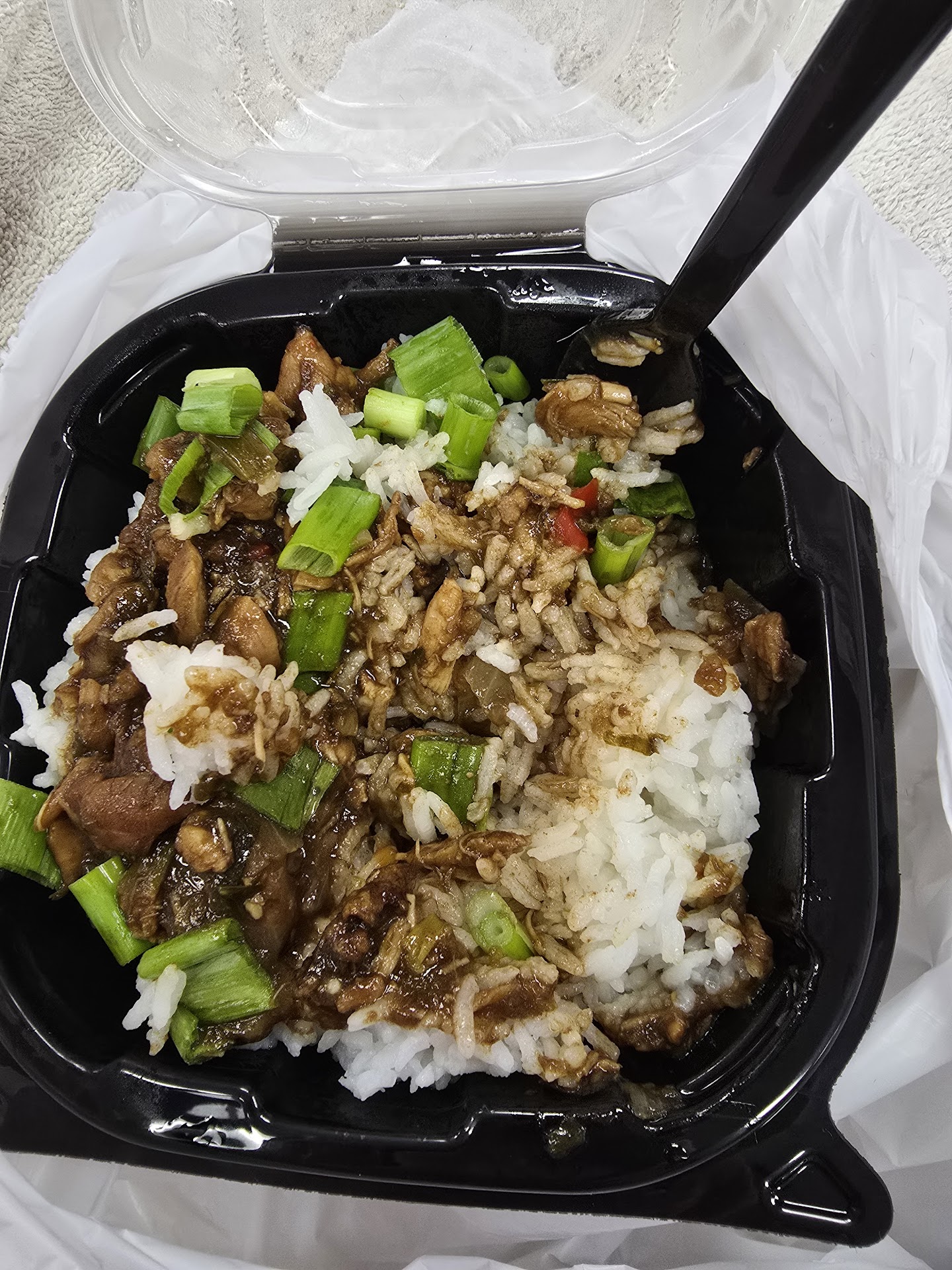 The bowl was awful. Rice was made with too much water so it was gummy and flavorless. The scoop of teriyaki chicken was mostly sauce and veggies which further watered down the already depressingly bad rice. The taste of the teriyaki chicken was good, though.