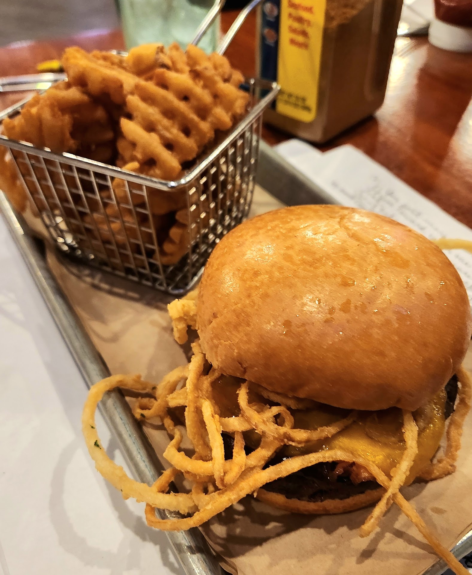 Read moreWe stopped here yesterday for our first time while passing through town. I wasn't sure whether to give two or three stars because it was really nothing special at all and prices seemed a bit high for the amount of food you got. My husband and I both ordered a different burger each and when they arrived, it literally wasn't any different then throwing them on the grill at home yourself, except you'd save money grilling it at home vs paying $13 there. We were not impressed. We ordered what we thought were beer battered fries and got overly greasy onion rings instead. We didn't want to complain, so we ate some of them but with how greasy they kind of made your stomach turn. It kind of threw us off that we had to ask for a menu.. not everyone is constantly on their phones or brings them with to scan some code just to try and look the menu up so that was off putting. We noticed the deserts pictured on a card at the table and decided to give those a try. My husband ordered the tiramisu and I ordered the chocolate pecan pie. I guess I'm not sure what we were expecting but for $4 & $5 a piece I would have thought we would have been brought something in a little bigger proportion and not taste like it was frozen/ store-bought. My husband's tiramisu really didn't have much coffee flavor It was pretty basic and my pecan pie pretty much just tasted like a chocolate chip and that was it. For us it definitely wouldn't be worth going back. After scrolling through and looking at some of the pictures posted to the restaurant page, it definitely makes us wonder if we came in on a "wrong" day or what because our food did not look that good nor was it proportioned as those...