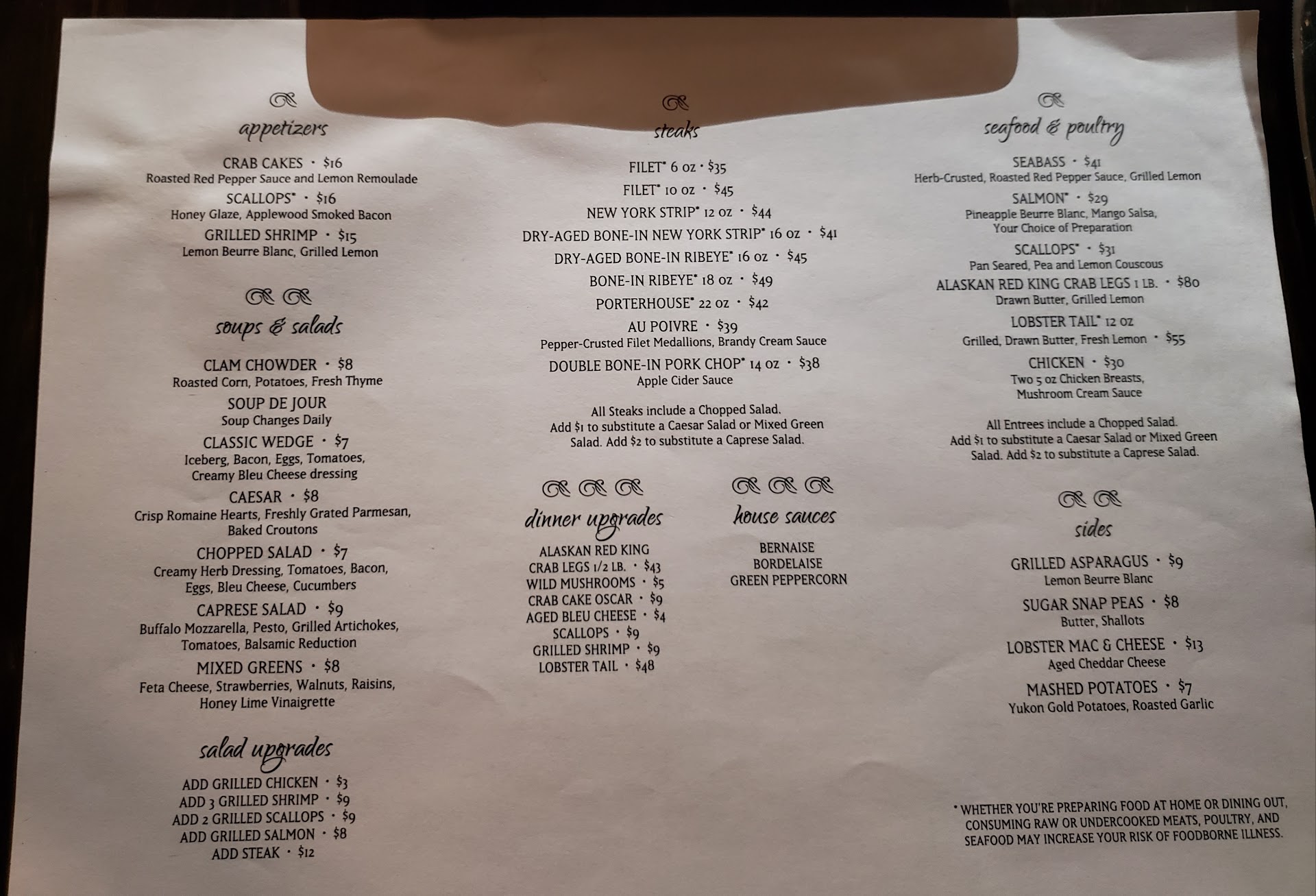Read moreWhen I called to make our reservation, I told the owner it was my son's 10th birthday and he wanted crab legs, so that's why we were choosing this restaurant we have never been to before (party of 6). We get to the restaurant at 1800. Wait for the hostess for 6 minutes to appear and be seated. Our table is in the back room and it is packed. Consider moving to the front but only small tables up there. Hannah was our waitress and was busting her butt. We put our 2-tier birthday cake on the table which clearly reads "Happy 10th Birthday Sterling." There were only 2 waitresses and they were understaffed. Hannah had to act as the bartender as well. Our food order was taken at 1820. We have 3 small kids with us who are starting to ask where the food was at 1900. Hannah overhears and apologizes for the wait. Food comes out at 1930. Crab legs were delicious but my wedge salad had blue cheese dressing and not the ranch I ordered. Fast forward-all steaks were great and prepared as ordered (e.g. medium rare) as well as the crab legs (we each had 4 legs) and rest of salads were good. Dropped almost $500 and 20% tip for Hannah. Overall summary: The wait time from being seated to food ordered to food presented to our table-way too long. Hannah was attentive but seemed rushed and was forgetting things like getting my new wedge salad (had to ask twice for salad to be returned with new salad) with the correct dressing. It would have made our night for staff to at least acknoweledge my son's birthday (he chose your restaurant) but not a word was said. Summary: We will not return because of understaffing and long wait times on food. For the $$ customers drop here, you need to make sure every customer feels special and does not wait lengthy amounts of time for food. Add a bartender as well, to allow the waitresses to focus solely on ordering and...