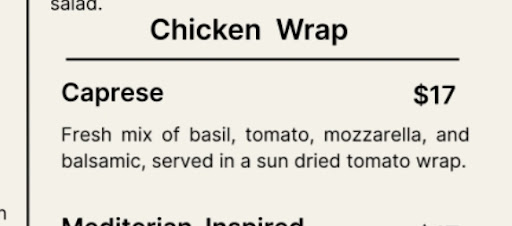 Read moreI wish I would've taken a photo of my meal. The menu said: Chicken Wraps: caprese -fresh mix of basil, mozzarella, tomatoes, balsamic in a sundried tomato wrap. So Im expecting my wrap to be: chicken, basil, mozzarella, tomatoes, balsamic. My order comes & its loaded with raw onions & lettuce. I hadn't bothered to tell the waitress that I was allergic to onions - bcs this meal shouldn't have onions based on the description. When she can by to check on us I explained this all to her & she didn't apologize, she just said - thats how it comes, do you want to order something different then? (I mean - no, I really wanted what I actually ordered) so she gets me a menu & I settle for french toast. My biggest frustration was there was no apology for the mix up & the meal wasn't offered to be made as the description lists it. To top things off, they weren't packed at all & it took quite awhile to get my french toast. My son finished his entire meal, while taking a good 10min break in between sandwich halves & I still didn't have my "replacement meal". Very disappointed in how this was handled. The menu should be accurate of what's in the dish, I shouldn't have been made to feel stupid about the ingredients being wrong. & I APOLOGIZED profusely for not stating I was allergic to onions & explained it was due to it not being listed in the description. 🫤 still - the only respone was "that's...