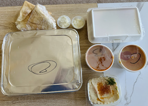 It came with two types of soup (not sure of the names), one bean-based and the other a potato soup. Both were delicious, but I personally preferred the potato one. I also added a small side of hummus, which was smooth and flavorful.