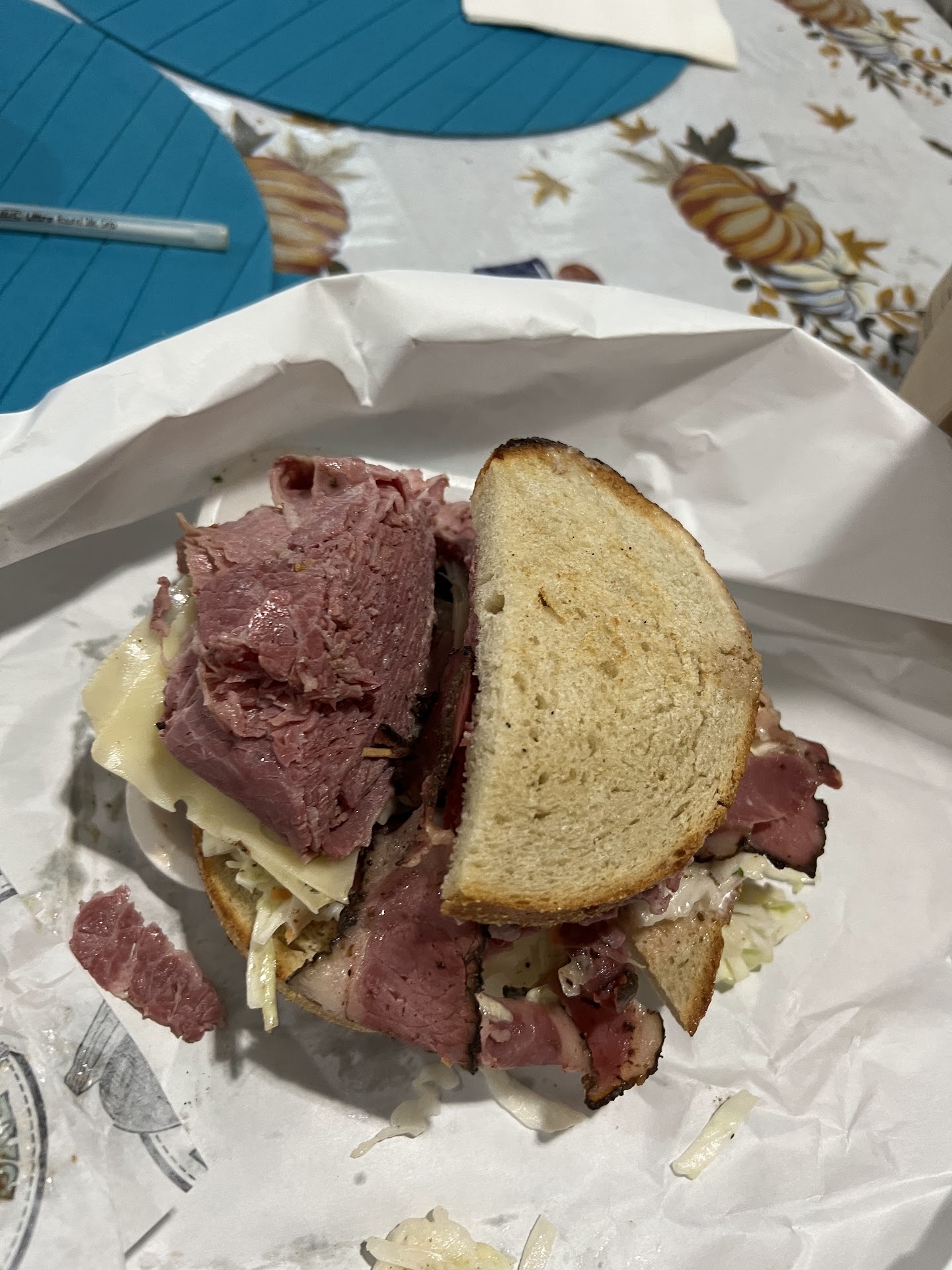 The corned beef on the sandwich tasted very good- pickles were spot on, the bread in the breadbasket was dry- and didn’t seem the same as what they used to serve- our waitress was very nice, friendly -