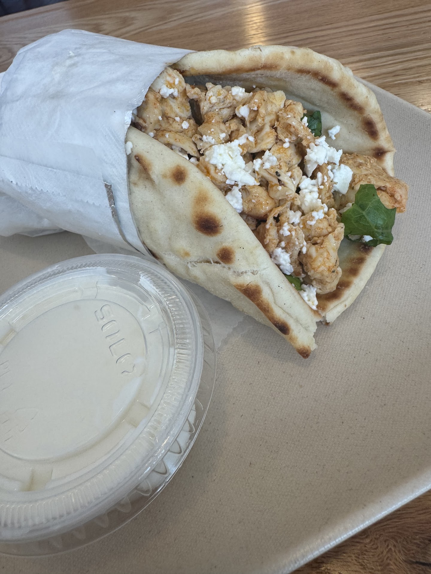 First let me say Tay…..such a kind human, he assisted me with my order and I really enjoyed our conversation. I have never ate here before and Tay explained the menu and the deals to me. He is a great asset to this establishment. The food …..10 out 10. I ordered the Chicken Gyro, it was fresh and very stratifying. The garlic was really good as well, if the garlic isn’t good I will not revisit a restaurant 🤷🏻‍♀️. Garlic was 🔥. Environment was clean and inviting. I will be back for sure!!!!!