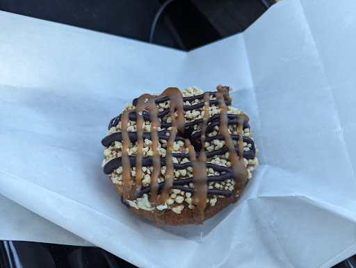 It wasn't a disaster when I walked in, but it was also clear that Glaze had been busy. The inventory was depleted and one employee was just finishing her shift and looked like she was on her way to take a nap, which, fair. (As an aside, she had a very pleasant, short conversation with the remaining employee behind the counter that was nice to see - they clearly get along and respect each other. Lots of good vibes). I'd taken a look at the menu beforehand, which had quite a few intriguing options. The one I'd had my heart set on was the maple/bacon, but unfortunately, other National Donut Day celebrants had gotten them first. I settled for my second option, which was the Twix Donut.