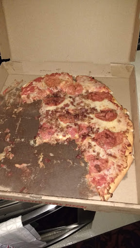 Got a X-Large pepperoni and bacon pizza carry out around 4:00pm. Prices were reasonable for what I was expecting but what I got was a major disappointment. When I opened the lid on the box at the counter half of the pizza was slid up onto the side of the box and pulled apart. Since the person sort of flopped the box on the counter and said "Here's your pizza" and went back to the kitchen in a hurry I just left cause it should eat well anyway.
