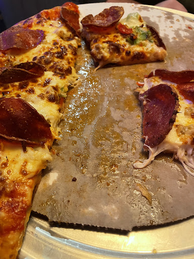 At home though it was worse than I thought. When my wife opened the box she asked me if I had dropped it. It did look that way since the outer slices of one side of the pizza was smashed against the side of the box. Looked like when it was slid off the oven tray they missed their mark. Some slices were overlapping other slices too. As she proceeded to pick that side of the pizza apart it was stuck to the bottom of the box. I noticed then that this pizza was totally just thrown together. No uniformity to cover the pizza with pepperoni, bacon just in the middle of pizza; and the cheese and sauce barely covering the dough. As she peeled the slices from the box it was evident why it was stuck to the bottom of the box. The grease was horrendous on the bottom of the pizza.