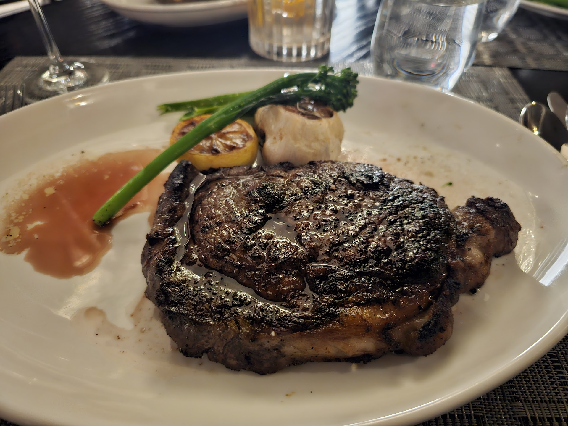 The crowds I front of us came and went, I guess making for interesting people watching at times. Our appetizers arrived and were delicious. Then came time for our mains. My wifes filet looks great however, as soon as my steak was set down I immediately questioned the food runner as it did not look at all like a strip steak but rather a rib eye. She said it was the strip and walked away. Our waiter then got to us about 5 min after the food delivery and I had elected to not cut into the steak asking him once again if it was the strip steak and he said yes, but would go check. He came back 5 more minutes later and said it was in fact the strip steak. Knowing that I have bought, ordered and cooked many of both strip and rib eye steaks I still did not want to cut into this as I was certian this was not the high end strip I ordered. I waited until a manager came with our bottle of wine and again asked him. He immediately said, not, that is a rib eye. It had been about 15-20 since the food arrived and I had told my wife to enjoy hers. Now the manager offered to re-fire the entire meal and sides but we elected to just have mine done correctly while my wife continued to eat hers. Finally my steak arrived and looked like what I envisioned. It was delicious and perfectly cooked. But if a waiter is going to recommend specific items, then they should certainly know what it looks like as well as any one else expiditing the food. We also received brussels and when I told the waiter we ordered the charred broccolini, he said that was his fault because he was having trouble hearing our order due to the crowds gathered around our table.