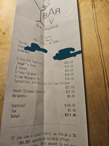 My husband and I recently moved to the area from the city. After a decade there, we are accustomed to many different restaurant styles and atmospheres. However, the experience we had at Bar Avalon in West Chester is unlike anything I have ever experienced. Shortly into our appetizer course the table in front of us had been cleared and a new group sat down. While we appreciate a fun, loud restaurant, this group was extremely inappropriate. They were so loud they were yelling over each other to be heard, cursing, and screeching. Shortly after sitting down, they were recognized by friends at the bar, and said friends joined them for a bit. Everyone stood up around the table and the group was even more loud and rude. The group did not seem to take the subtle hints of everyone around them glancing at them for so rudely interrupting their meals. My brother-in-law eventually got up to use the restroom and spoke to a group of staff members about the table. Our server came over and asked if we wanted to move tables. Not her fault, but the table we were to be moved to was two tables away - it would not have made a difference and we were halfway through our main course. This table then received a wine tasting, were offensive again, but then received food and quieted down a little. Once they ate their apps, the distastefulness started up again. At this point, I asked our server if I could speak to the manager. At the same time, one of the females at the table flung her arms back so fast that she almost hit my brother-in-law. My brother-in-law and husband both asked the table to calm down. One of the males at the table said, “oh, are we bothering you?”, my husband said “yes, you are being extremely rude”. The manager came over at that time. He asked “Is there a problem?” (Management 101, this is not how you address patrons!) My husband said “yes, this table next to us is causing a scene”. The manager said, “well, we offered to move your table”, and then he had the audacity to tell my husband that he was the one causing the scene. (My agreeable, non-confrontational husband... causing the scene? Yes, my husband did raise his voice in that moment, but we were not causing the scene.) I stepped in and asked the manager if he could just speak to other table. Instead of even asking them to quiet down, he only asked them to stop cursing. Clearly the manager was of no help, so instead of ordering desserts for my husbands birthday, we asked for our bill at that time. Over $200 for the worst experience. (We gave our server her full 20% tip, we did not ask to have the bill adjusted for the experience, nor was it.) The worst part about this is that as since it was my husband’s birthday, we were looking for a fun night out without our young child. Management should have stepped up and addressed this table before they even had put an order in, or if not then, when my brother-in-law had spoken to the staff members about the table. Food: okay, wine list: terrible (small list, not great wines, they ran out of the bottle we ordered, markup at 400+%), management: offensive, ineffective, shameful. Experience: horrible. Not sure how anyone can condone running a business in...