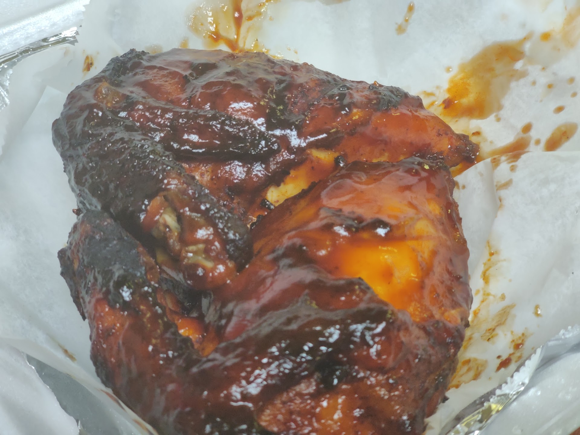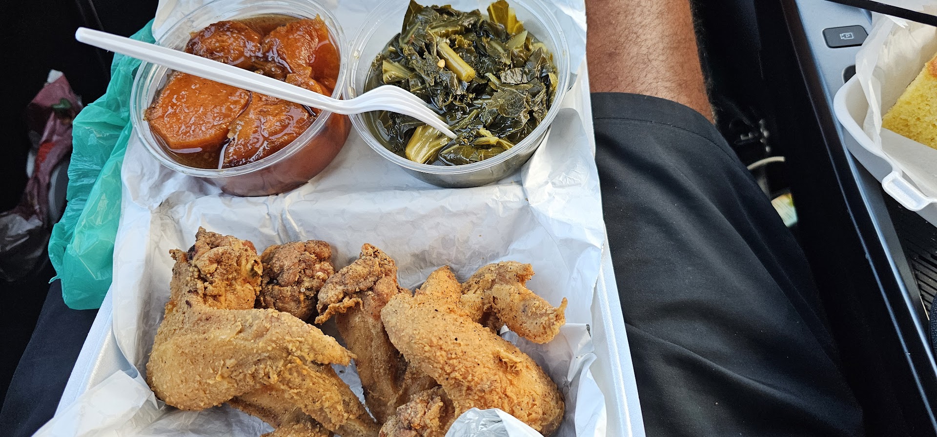 Read moreI'm glad I found this place! Omg it's the warmest atmosphere, nicest decor and the best staff to have for ANY business. It was VERY Welcoming. Now on to the food....I ordered Fried Chicken Wings, Collard Greens, Yams and a piece of cornbread. I'm going into detail cause it matters...so wings? FIRE! I asked for them to be fried hard and they were. Nicely seasoned and crispy. U can tell they clean their chicken well and the grease was still clean even at ordering 30 mins before close. The grease on the chicken did NOT taste like it was burnt or old . Yams were perfect. It tastes like how ALL Yams should. Sweet, soft, "syrupy" and not undercooked. No Yams should have a crunch. Greens were good as well! Perfectly seasoned yet again. Only thing I would change if any (and this is just for me) is to remove some of the greens water but again VERY tasty and I ordered almost at the close of business. Cornbread has excellent flavor. A little on the dry side for me but I would still order it because it has good flavor. If i took it home i would just add butter and BOOM! All and all...I WILL be coming back and trying some other dishes. I appreciate the warm welcome, service AND the FOOD. Oh and they have their own sauce! THAT was tasty as well...I would use that on my ribs or something next time. It's just not for my chicken. Food is even priced at the right price point to not feel overcharged. I spent under $20 for the entire platter. 10/10...