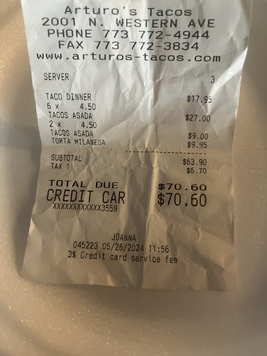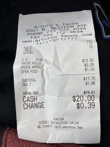 Read moreFirstly, I rated the atmosphere a 5 because I’m introverted. If you show up on an afternoon you’ll know why. Pretext II I’ve probably spent close to 4k over the last 20 yrs on food trucks. Now the GOOD part. Pico de gallo is superior to anyone else according to the palette of Perry. No, I have not eaten at every restaurant in the Midwest (former rideshare driver) or southern states so take with a grain of salt. However my palette has great wisdom . At 5’11” 134pds , 3 tacos pollo & rice is the wall. If I want to drive a car safely, u understand? You will try the tacos and you will try the rice. Now listen carefully let me help you because I drove down for lunch from Wisconsin. I’m saying that to say this; food is better than sex or women. The sauce is not for the tacos it is for the rice. 4 cups precisely is enough (I prefer 2 green 2 red). You want each rice grain fully submerged in a spicy paste like soup(continue to stir until satisfied). If you order the large side of pico de gallo even better but I only ordered on my tacos. Staff is friendly , elder señor on the grill has been running Arturo’s ever since I stepped in the door about 10 yrs ago. And if you think it’s too expensive it ain’t Taco Bell. Go return some useless junk you don’t need back to the store and treat yourself to...