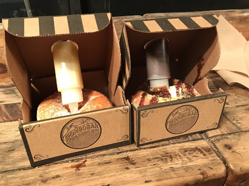 My friend got the s'mores one and I got the vanilla cream custard bombiloni. Both were so good! For the taste, the actual bombiloni was warm and soft yet chewy- just like the Italian deal. For the presentation, both of them came in a cute box with a hole in the middle to hold the large pipette (the filling of the bombiloni was held in the pipette and you can squeeze it to DIY and add filling vs. already having the filling squeezed in usually which makes it fun! The s'mores one was so pretty with a huge marshmallow and chocolate drizzles. There was also a bar table of seating that could maybe seat 10 so it was nice to be able to sit and enjoy.