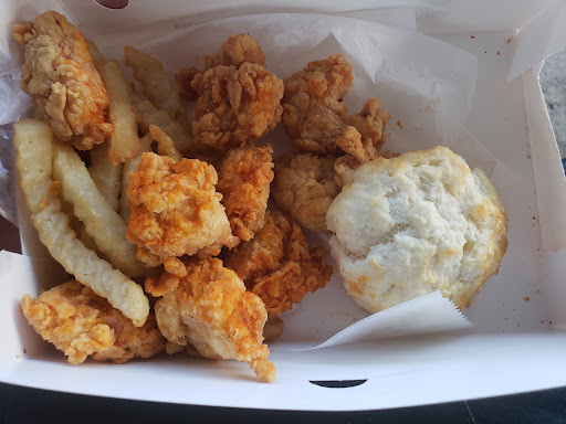 My order was ready in mere seconds. I had asked for fries, but apparently a second side comes with it so they threw in a whopping 3 pieces of fried okra. The entire dish was underwhelming. The megabites were just dry chicken tenders with dry rub on them. Of course since dry rub really isn't meant to be sprinkled on top of breaded chicken you can barely taste it. The chicken doesn't even look like the pictures. In the pictures the entire chicken is orange indicating that it's supposed to be covered in the seasoning or some sort of sauce. Instead you have dry chicken with a little spot of orange (some barely any at all.) They skimped out on the fries & okra too.
