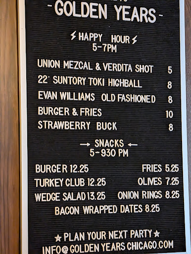 Golden Years is a great lil West Town spot for larger or small groups. Thereās a lot of seating and the bartender was super active and checked in with us often even though we were over at one of the tables. Tried a few of the cocktails including the Bitter Harvey, Singapore Sling, and the Strawberry Gimlet. I would order each of them again, they were all very fresh and delicious, but the Singapore Sling was definitely my fav! My friend also got the vegan burger and said it was great. Good music as well....