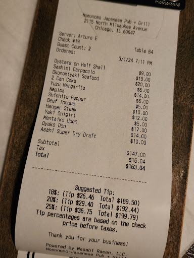 Overall, despite ordering three appetizers, four drinks, four yakitori items, and two entrees between the two of us, we felt as though we were treated poorly. The quality of the food was mediocre at best. It's unfortunate that Chicago lacks many options for authentic izakaya-style cuisine at reasonable prices. However, one thing is certain: I will not be...