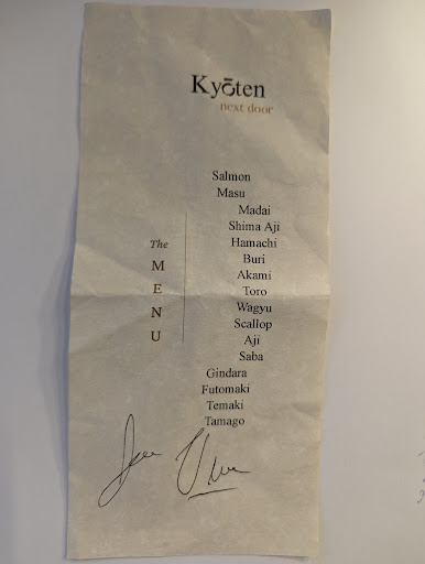 Phan the Man himself graced our presence and explained to us that Kyoten Next Door was supposed to be a purely traditional omakase experience, with mostly nigiri and things that are "not super rare" like scallop (and Miyazaki A5, apparently). However, he did promise that it is otherwise the same good fish, so I can contend that the fish is legit. Good thing I took a picture of the menu, so you can entertain some of my comments on it here: