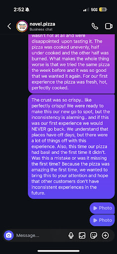 When the manager came out we told him about our experience and he said there must’ve been a miscommunication. He offered a partial refund and said that if he had been given a bad pizza he would’ve taken it back. We told him that we were headed to the north side from the restaurant and didn’t have time to come back, this is why we were looking for a way to contact them in the moment but there was no phone number.
