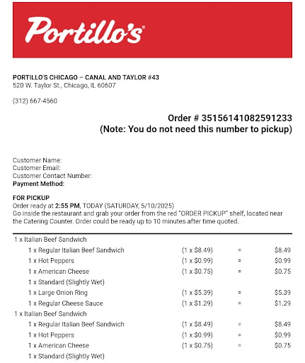 I placed my order over the phone, so I could pick it up when I arrived at portillos. When I called and talked to an agent (you are no longer are able to call the portillos directly anymore). I ordered a large cheese fry, she got that part of the order down no problem. Then I ordered a cheeseburger no tomato, no onion. The agent couldn't wrap her head around no tomato, no onion. She changes the order around and asks, so you want a cheeseburger, with only mayo, ketchup, lettuce, and tomato. I responded that she forgot the pickle and that it was no tomato and no onion. She finally got that part of the order correct. Then I order a double cheeseburger with only ketchup and sport peppers. She responds with, that is not an option. She can give order me only ketchup, but sport peppers is not an option. I told her I can walk into any portillos and order my double cheeseburger with only ketchup and sport peppers. She apologized and informed me she is a third party vendor she is limited in what she can do. I told her no problem that I will just get my sport peppers at the restaurant when I get arrive. When I arrive at portillos to get my food. I walk up to the cashier and give her my name for the order, and explained what happen on the phone, and if she could get me a cup of sport peppers and the number for corporate, because ordering on the phone is a joke. She stood there with a black look. I again asked for my order, and she'd if she could get me a cup of sport peppers. She finally grabbed my order, and grabbed the sport peppers. I again asked her for the number for corporate. She asked if she did something wrong. I smiled and told her no, that I needed it because of the phone ordering. She doesn't say anything, and walks away around the corner for about 30 seconds. She comes back and says that she wants to make sure that she gets the correct phone number for corporate. She wants away again comes back 30 seconds later and grabbed a piece of paper and a pencil walks up to a wall and writes down there number for corporate. She hands me the paper and I go home with my food. I open the cup of sport peppers to put them on my burger, and there are five tiny little peppers in the cup. Usually if you get a cup it is full (tiny little chops though, usually about 15 sport peppers). Not a huge deal, but not as many as I would have liked in my burger. Then the final straw is when I opened my burger top to put the peppers on, I only have a small smear of ketchup, and a small...
